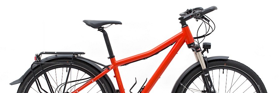 FINDER FD3 – Ein leuchtend rotes FD3 mit kompletter Alltagsausstattung für eine Kundin. Die Suntour-Federgabel erweitert nochmals den Einsatzbereich und Komfort sowie die Sicherheit. Reifenformat 57-584, Farbe RAL2002, Gewicht 16,0 kg.