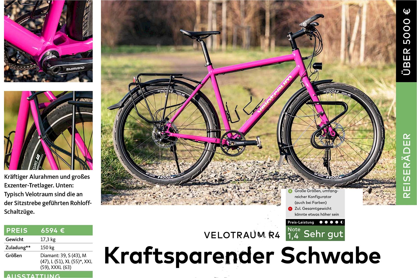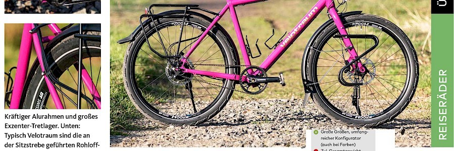 Wir haben die Gesamtnote „1,4 = Sehr gut“ erhalten. Zum Test standen sechs weitere Reiseräder mit gekapselten Schaltgetrieben einschlägiger Marken. In dieser Runde schlägt sich das Velotraum hervorragend. Das Fazit der Radaktion lautet: „Das Velotraum ist ein kräftig gebauter Leichtläufer mit exzellenter Stabilität und Kontrolle. Top sind die Wahlmöglichkeiten bei Farbe und Ausstattung.“