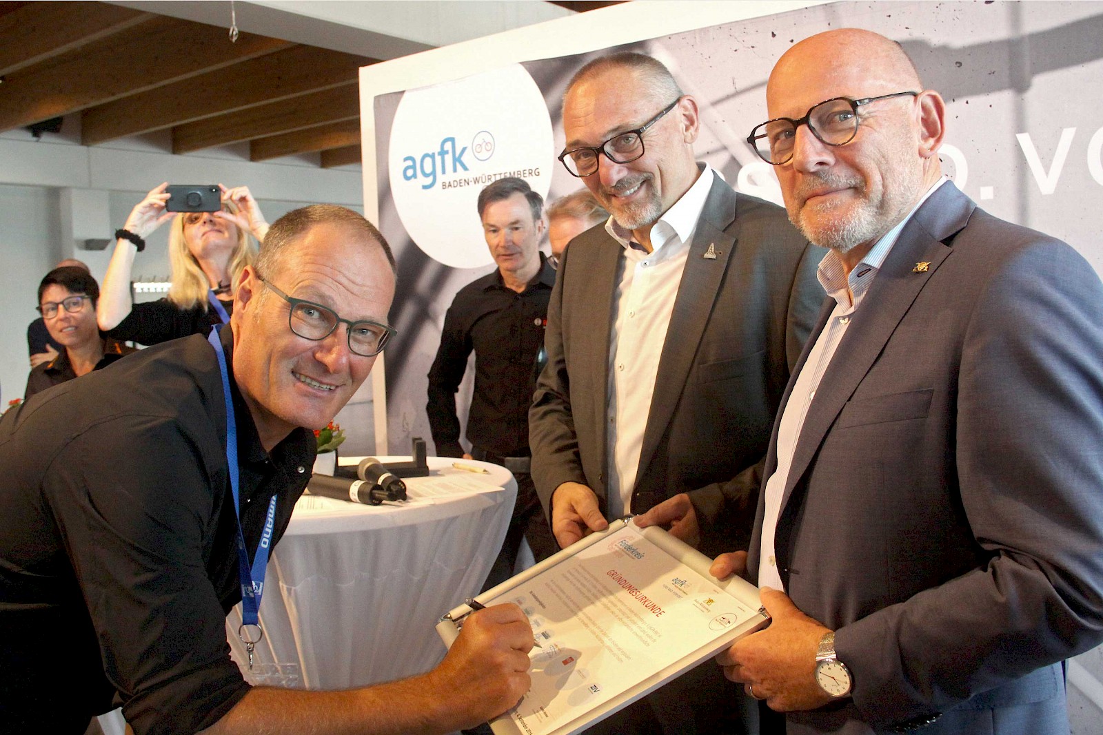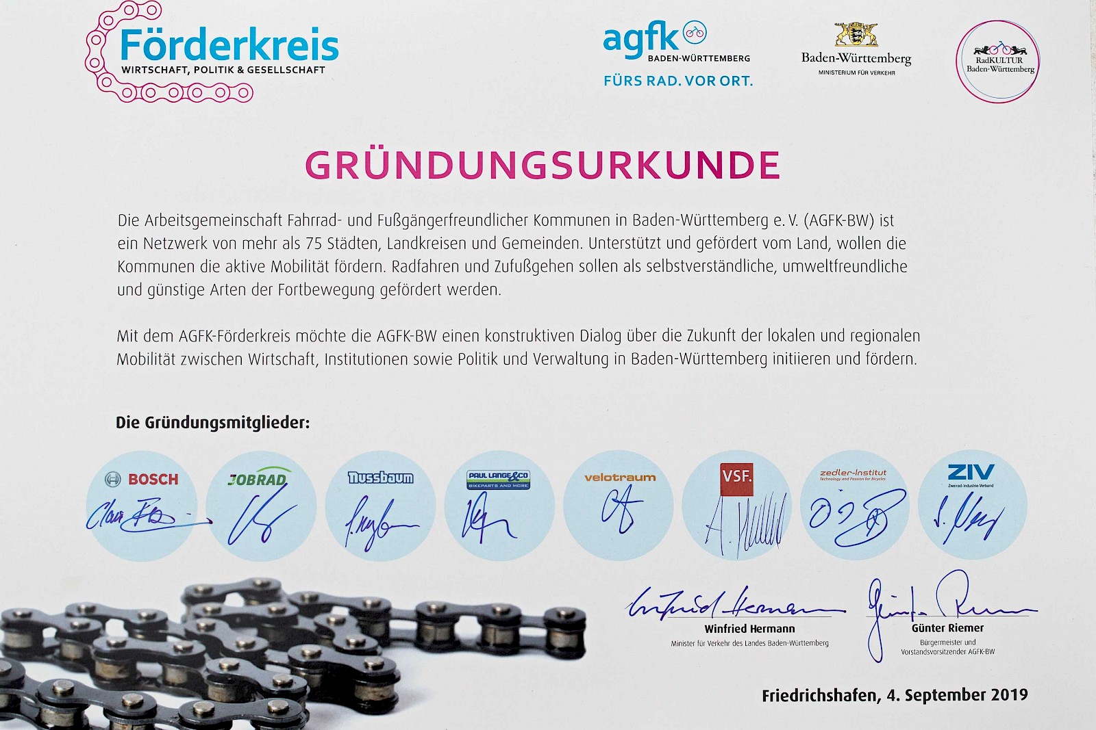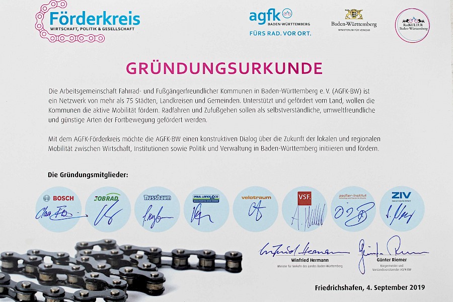 Velotraum ist seit der Eurobike ein Fördermitglied der AGFK. Die Arbeitsgemeinschaft Fahrrad- und Fußgängerfreundlicher Kommunen in Baden-Württemberg e. V. (AGFK-BW) ist ein Zusammenschluss von über unterschiedlichsten 70 Kommunen, die den Rad- und Fussverkehr voranbringen wollen. Die Fördermitglieder aus der Fahrradwirtschaft sollen dieses Gremium nun um unternehmerische und fahrradspezifische Facetten erweitern. Das erste Treffen findet im Frühjahr 2020 statt.