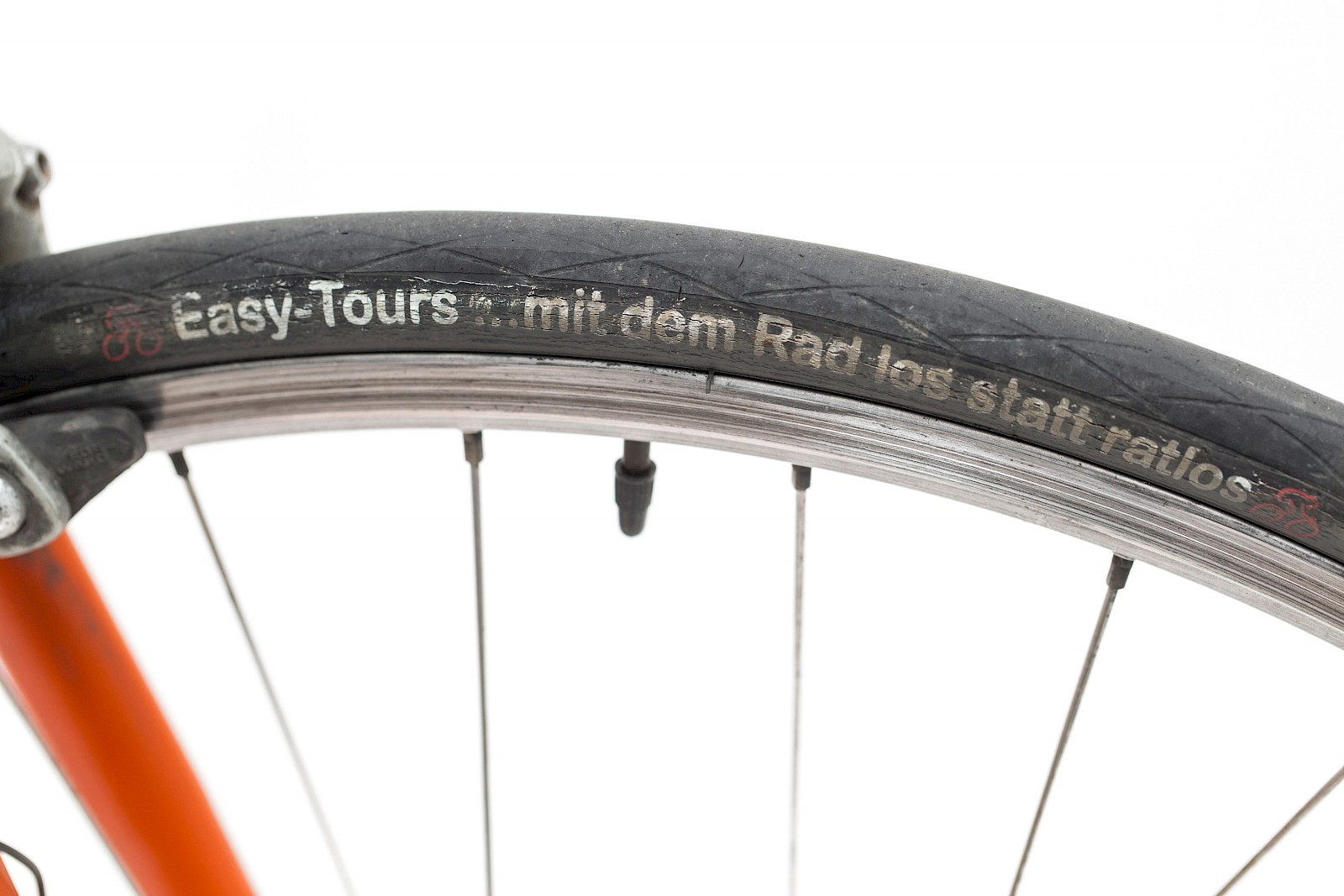 Was zudem ins Auge sticht ist die unglaubliche Filigranität – das Rädchen ist geradezu durchsichtig. Neue Erkenntnisse, Materialen und Anwendungsbereiche haben dafür gesorgt, dass sich bei der Dimensionierung von Rahmen und Bereifung viel getan hat, sicher zum Leidwesen von manchem Retro-Fan. Für ein Rennrad waren damals schon 23 Millimeter breite Reifen das absolute Maximum, und klar, so ein Rad war damals ausschließlich für die Straße gedacht, die damals leerer und besser waren als heute. Die Gebrauchsspuren zeigen, dass der orangene Renner nicht nur in der Garage herumgestanden ist, sondern ordentlich im Einsatz war und die eine oder andere Blessur davon getragen hat.
