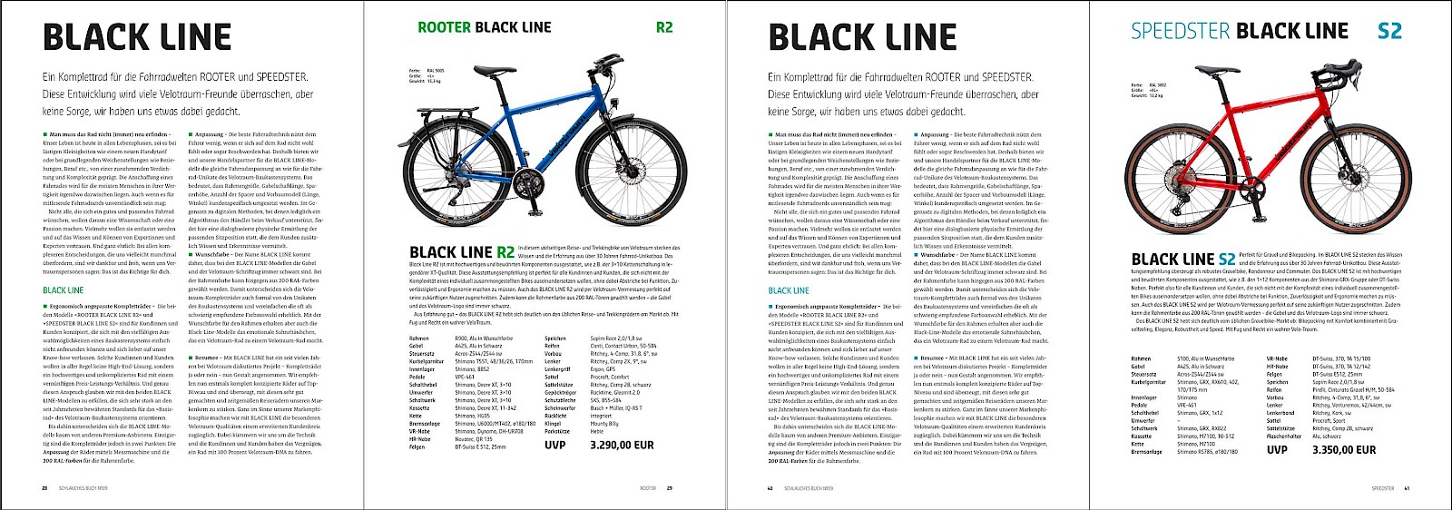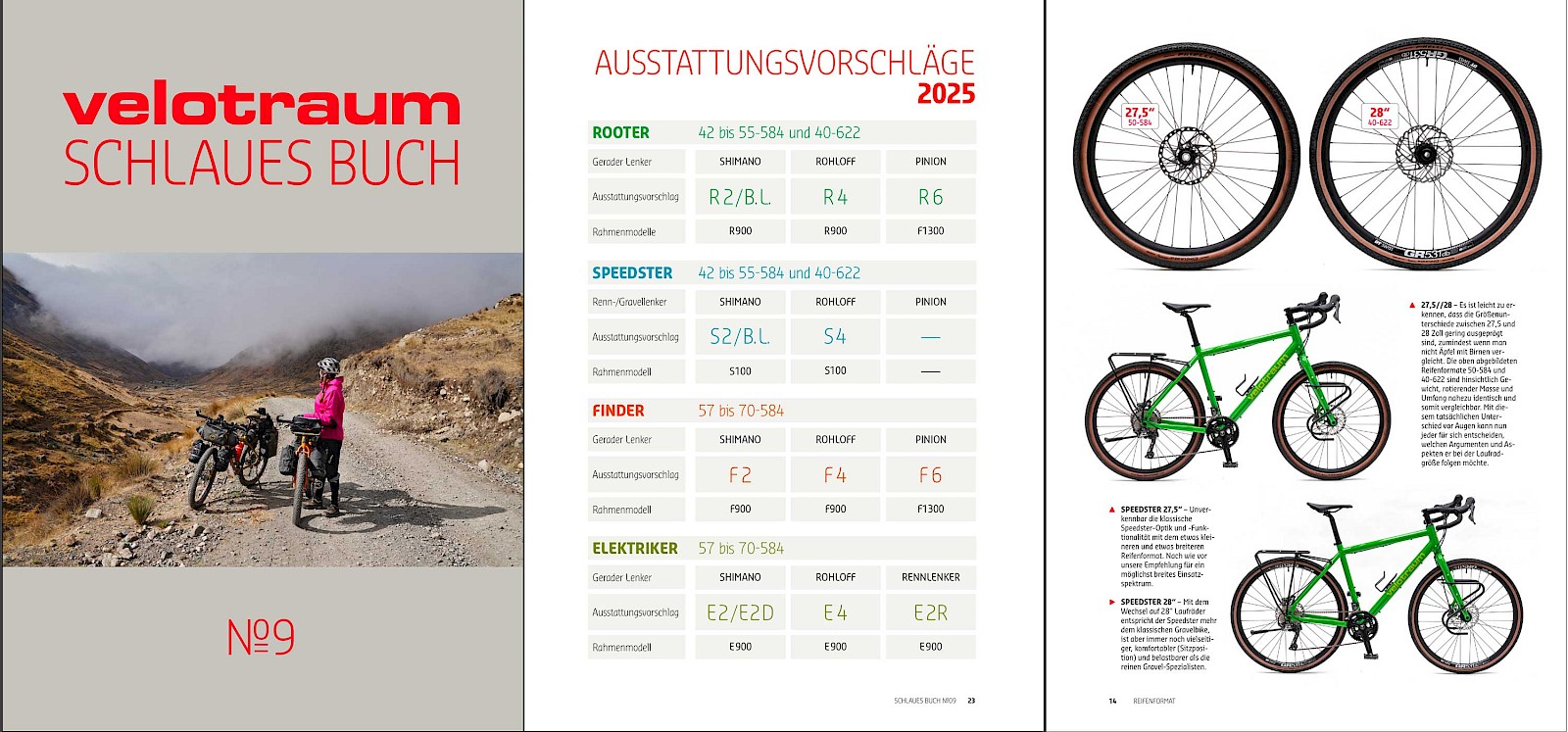 Neuerungen, bzw. Ergänzungen im Sortiment, wie die 28-Zoll-Laufräder für ausgesuchte Räder sowie die Black Line sind dazugekommen, die Rahmengeometrie des Elektrikers wurde überarbeitet und dieses leichte Pedelec ist jetzt auch mit Rennlenker und Di2-Schaltung zu haben. Fans der Marke werden auch die frischen Fotos, beispielsweise vom Bikefitting, wertschätzen. Es gibt viele Tabellen für zahlreiche (neue) Ausstattungsvarianten und der Chronist fasst in vertrauter Manier die Philosophie und Kernkompetenzen von Velotraum zusammen – Das ist in gedruckter Form aber nicht nur anschaulicher, sondern auch besser verdaulich als auf der Website. Für Menschen, die das Schlaue Buch zum ersten Mal in den Händen halten, ist es eine unverzichtbare Informationsquelle, wenn sie mit einem Velotraum-Rad liebäugeln, für Fachhändler eventuell ein Handbuch oder sogar die Bibel, in der sie immer Antwort auf ihre Fragen finden. Auch wir bei Velotraum nehmen das Buch während unserer täglichen Arbeit oft zur Hand und es macht sich gewiss sehr gut auf jedem Couchtisch.
