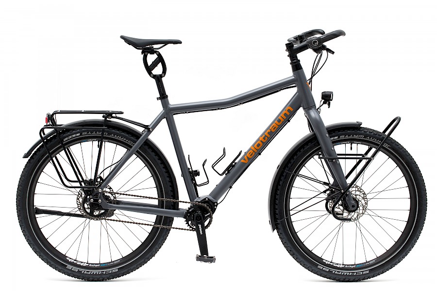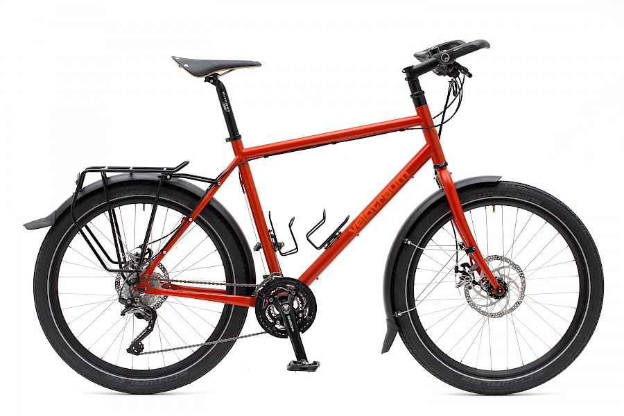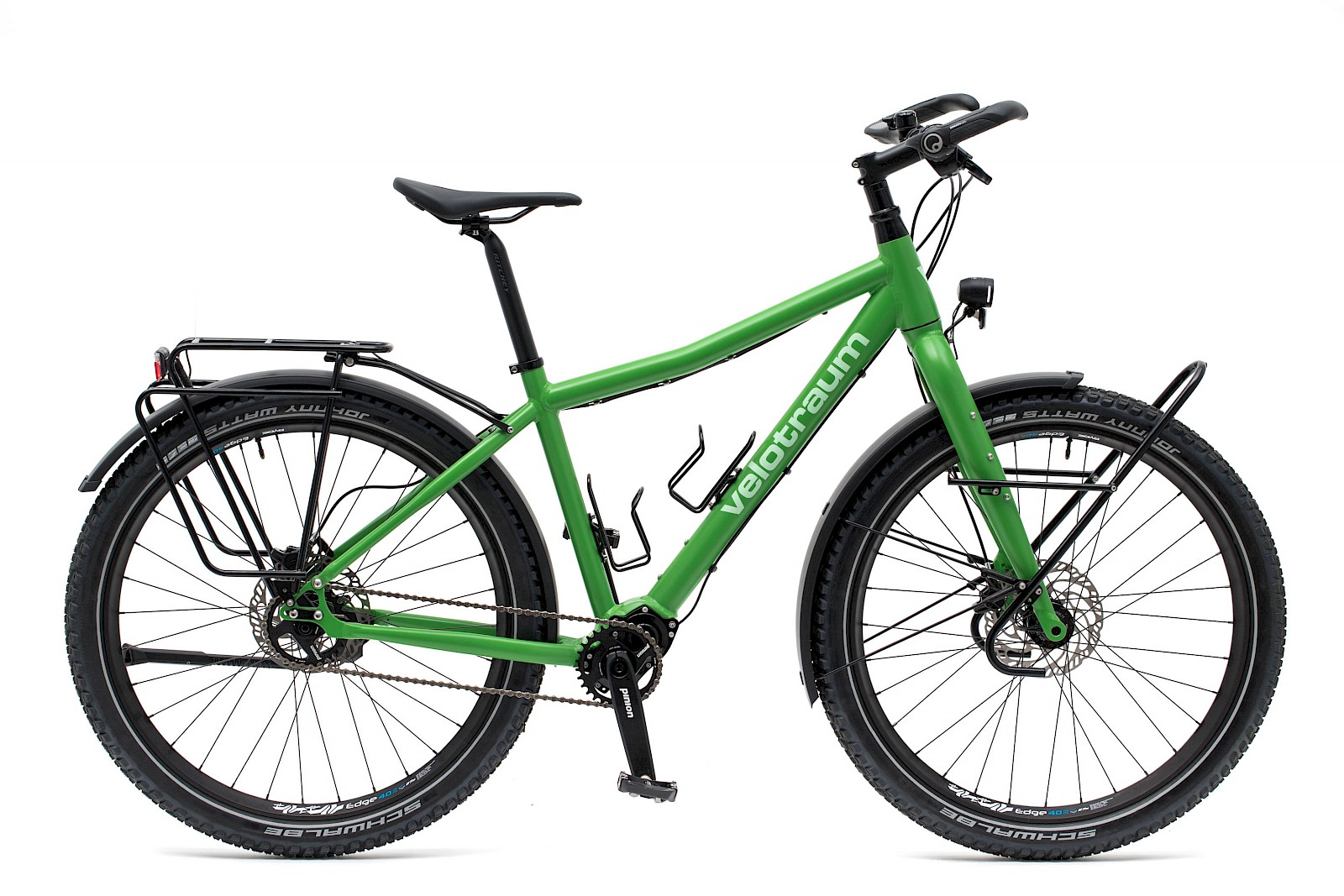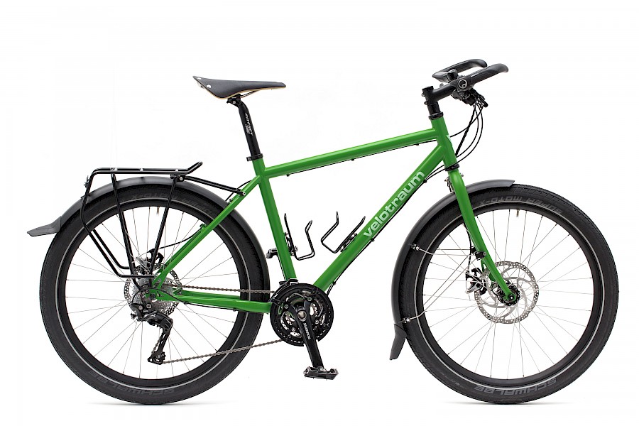 Die beiden oben abgebildeten VK3-Räder sind für ein Paar aus Freiburg und weisen einige Besonderheiten auf. Zum einen sind sie mit raren Komponenten wie 3×10-Schaltung, Tubus-Träger und Shimano-GR500-Pedalen bestückt, und zum anderen ist da die Kombination aus unverwüstlichen VT400-Stahlrahmen und 62 Millimeter breiter 26-Zoll-Bereifung. Dazu gesellt sich eine hochwertige, aber einfache Ausstattung, bestehend aus XT-Schaltgruppe, feinen DT-Swiss-Naben und mechanischen Tektro-Scheibenbremsen.