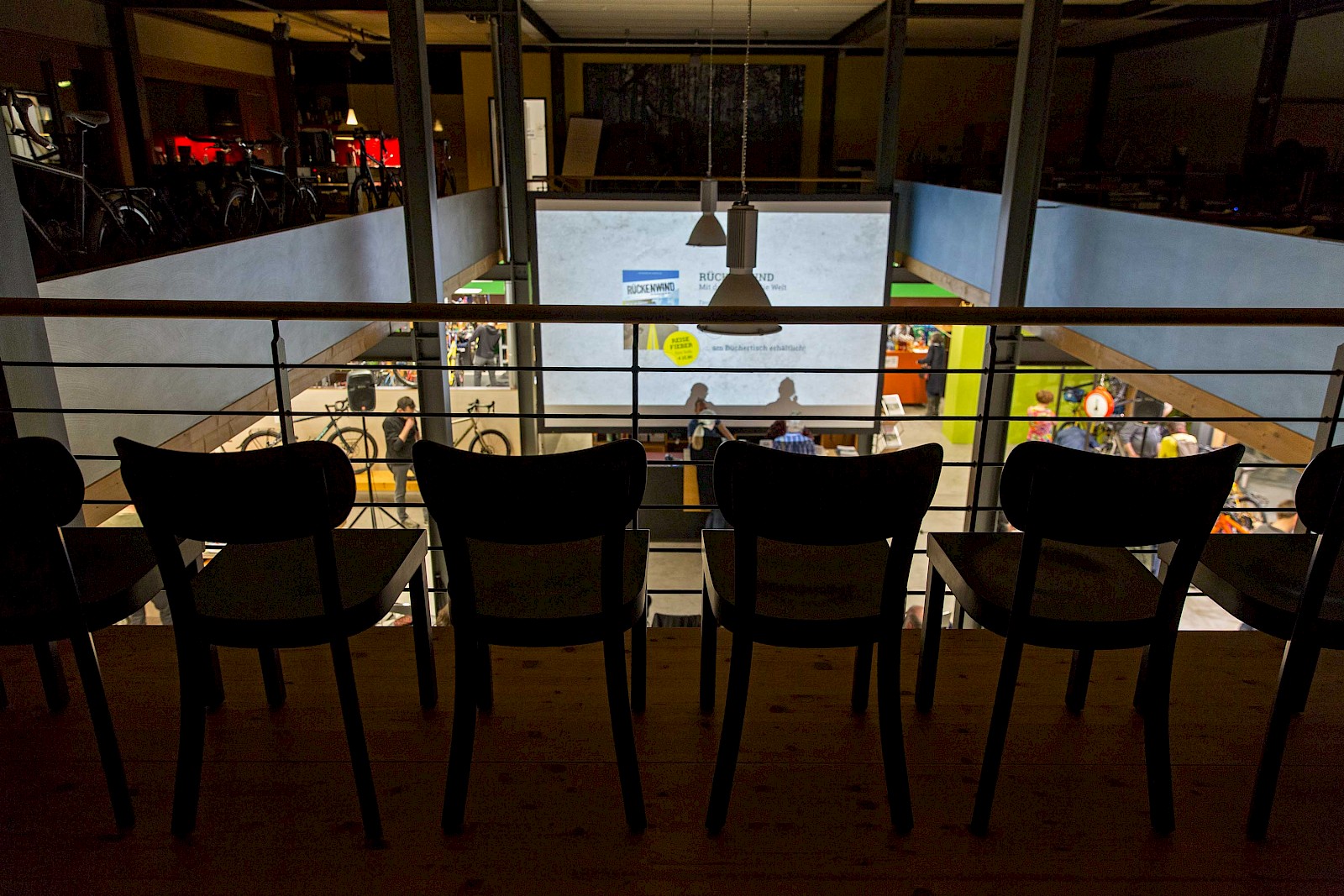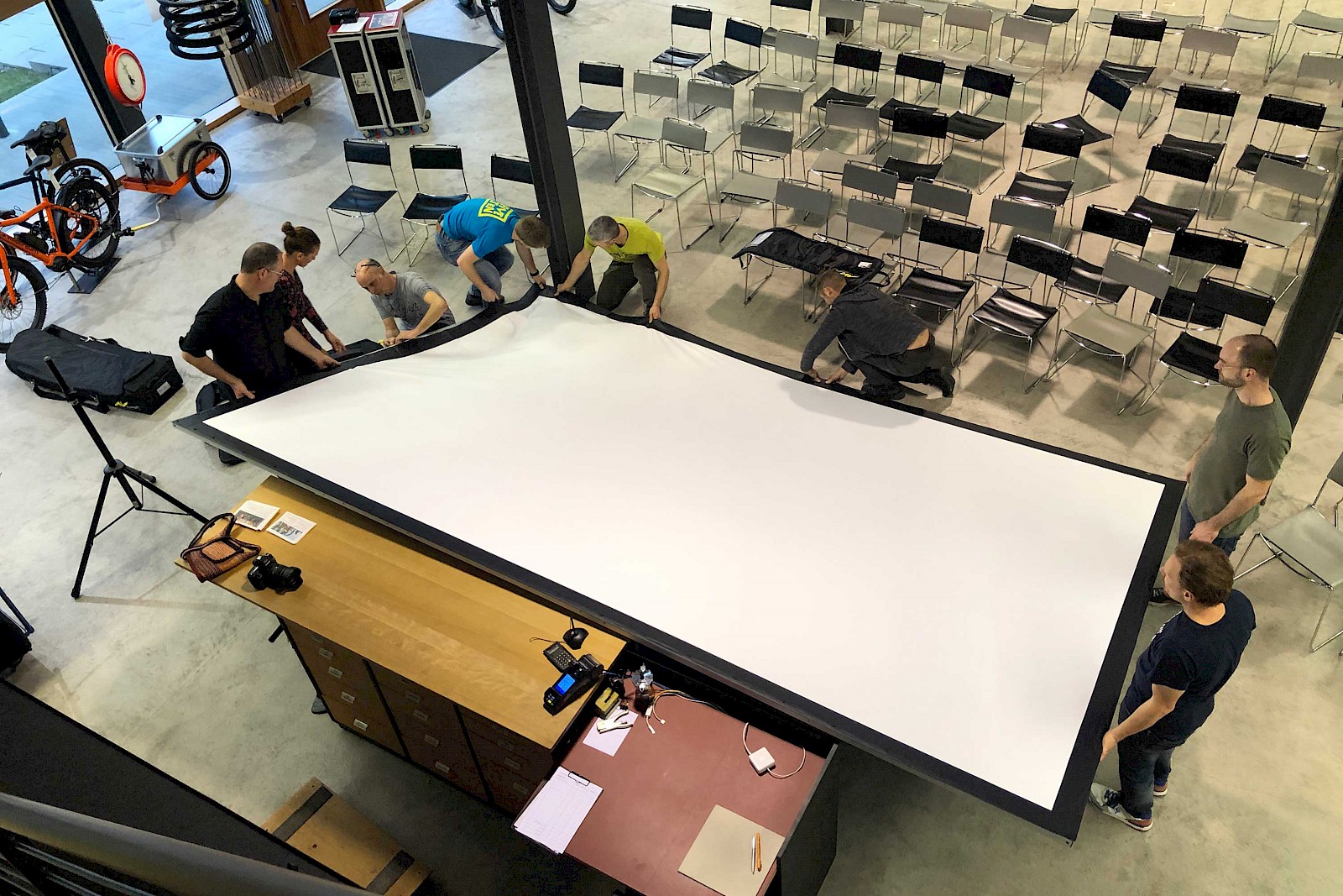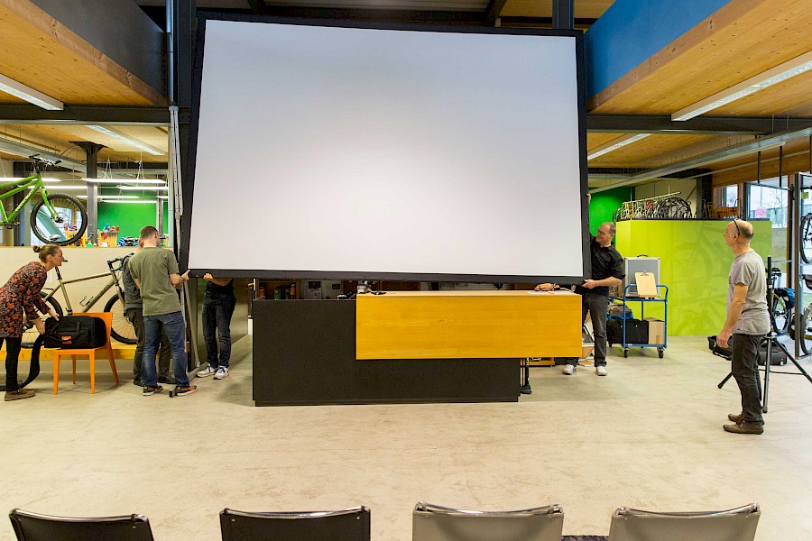 Schon der Auftakt, also der Umbau der Velotraum Ausstellung in einen Veranstaltungsraum, brachte eine »Wendung« um 180 Grad. Die 4,50 × 2,75 Meter große Leinwand wollte sich einfach nicht in das bewährte Rad-und-Reise-Setup einfügen. Von Andi kam daher der Vorschlag, einfach in die andere Richtung zu projizieren … Gesagt, getan – Kurzentschlossen drehten wir das Ganze um 180 Grad und die Live-Reportage konnte ihre ganze visuelle Pracht entfalten.