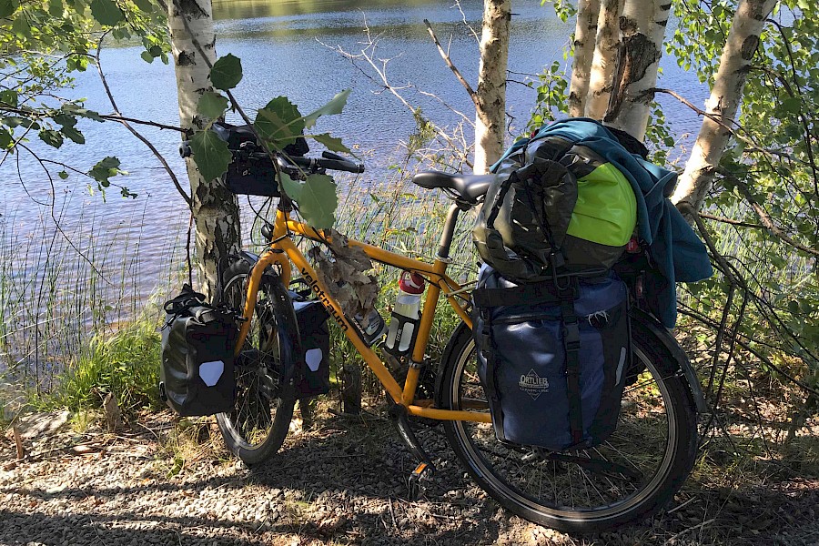 Hier bei einer Pause an einem See zwischen Birken, nach einem erfrischenden Bad geht es gleich weiter.