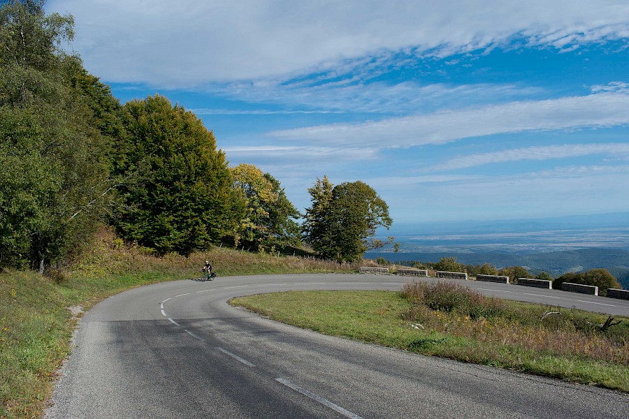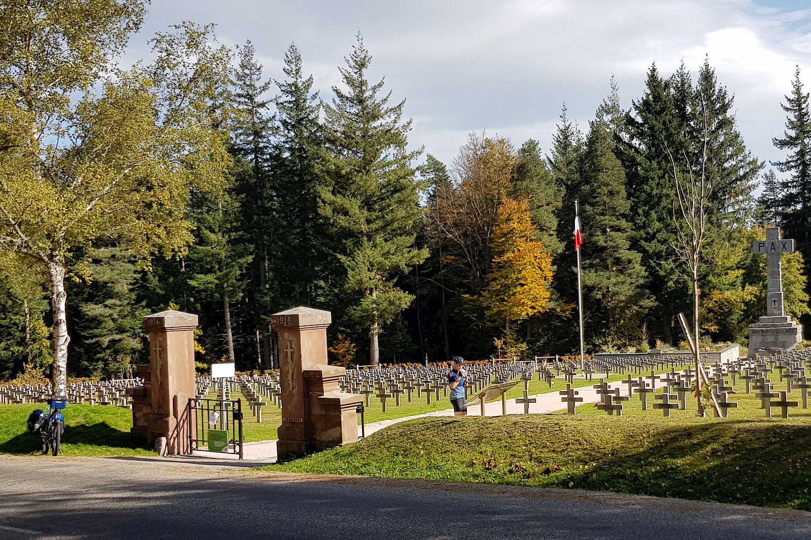 In Cernay gestartet ging es am ersten Tag über die Routes des Crêtes, eine alte Militärstraße aus dem 1.Weltkrieg, bis nach Ribeauvillé. Obwohl ich diese Strecke innerhalb von 12 Monaten zum dritten Mal gefahren bin, begeistert mich diese Route wegen ihrer tollen Aussichten noch immer. Auch wenn man nicht vergessen darf, welcher schrecklichen Geschichte sie ihre Existenz verdankt. Sie diente nämlich der Versorgung der französischen Front. Diese Geschichte ist auch überall präsent, nicht nur durch die Soldatenfriedhöfe und Gedenkstätten, sondern auch in der Landschaft.