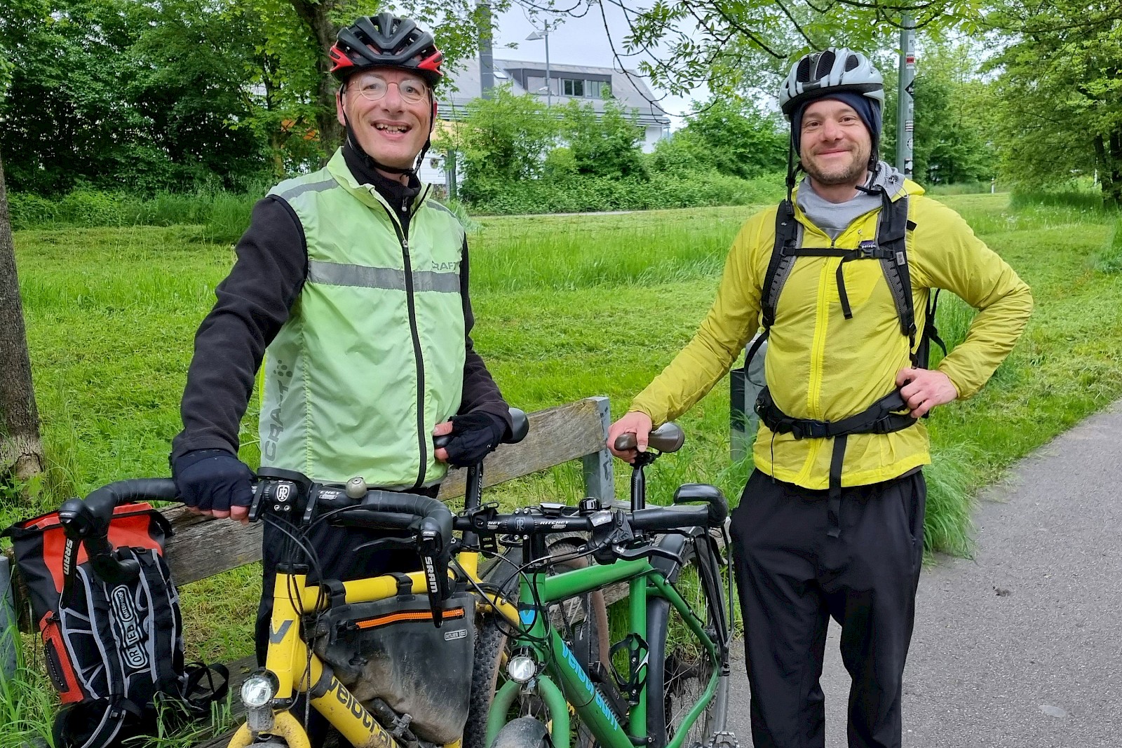Nun habe ich (Banker) mal kurzentschlossen den sympathischen Veloträumer angehalten. Flo (mit grünem Fahrrad) fährt bei jedem Wetter von Esslingen in Richtung Plochingen, ich (gelbes Fahrrad) andersrum. Flo arbeitet in einem technischen Beruf (ich hab´s gewusst!).