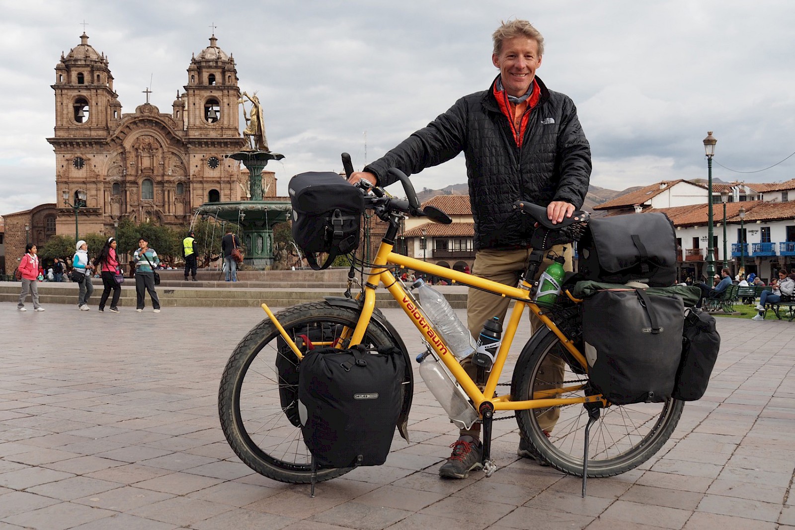 Ankunft nach 3.600 km durch die Anden im peruanischen Cusco, der ehemaligen Kapitale des legendären Inkareiches. Ausgestattet mit einem Nabengetriebe aus Kassel und einer Bremsanlage aus Bad Urach trug mich mein VT-400 (cross cromo EX) zuverlässig über die höchsten Andenpässe weiter hinunter nach Argentinien.