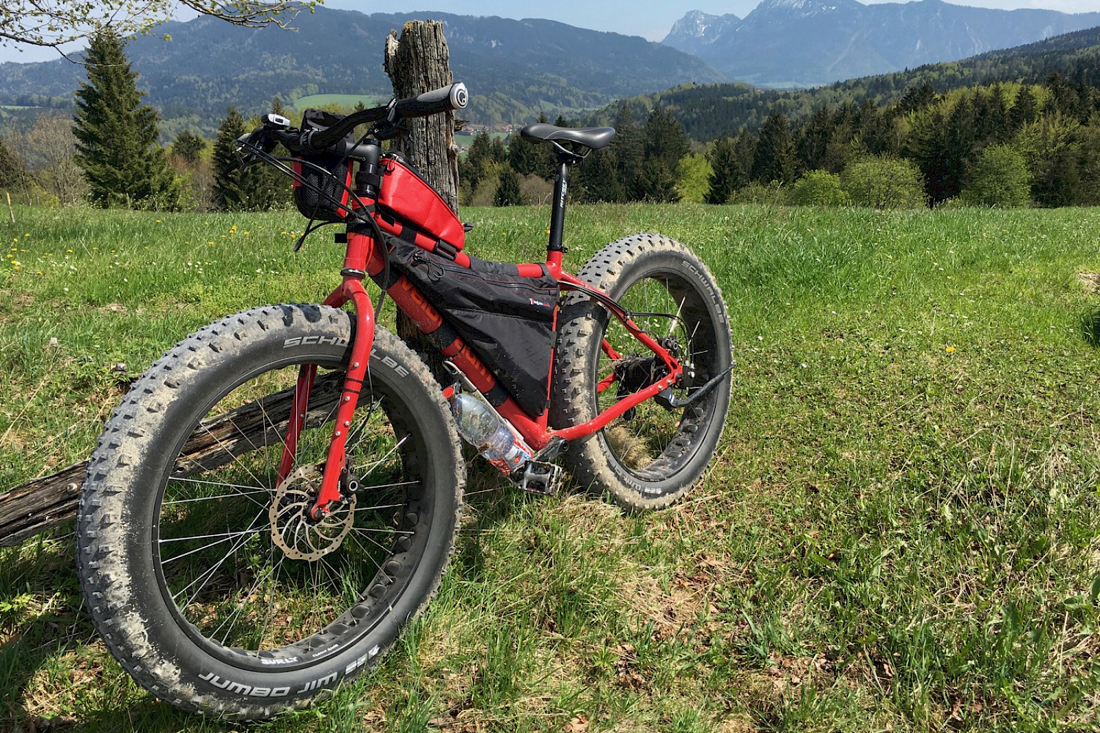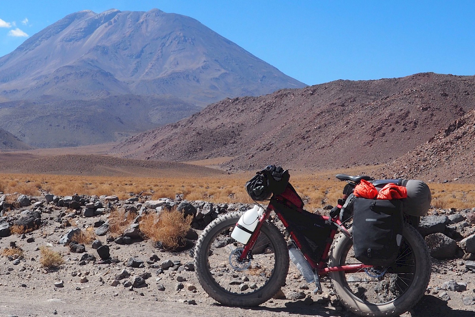 Mit meinem Pilger mit Wüstengepäck auf über 4.000 m vor einem Vulkan an der Lagunenroute in SW-Bolivien. In den Wasserflaschen an der Gabel und am Unterrohr, sowie mit den Wasserbeuteln in der Rahmentasche lassen sich 16 Liter Wasser bunkern. Genug für drei Tage und zwei Nächte. Der Pilger ließ sich trotzdem noch präzise fahren, auch im tiefen Sand, wo andere Radler schon längst schoben.