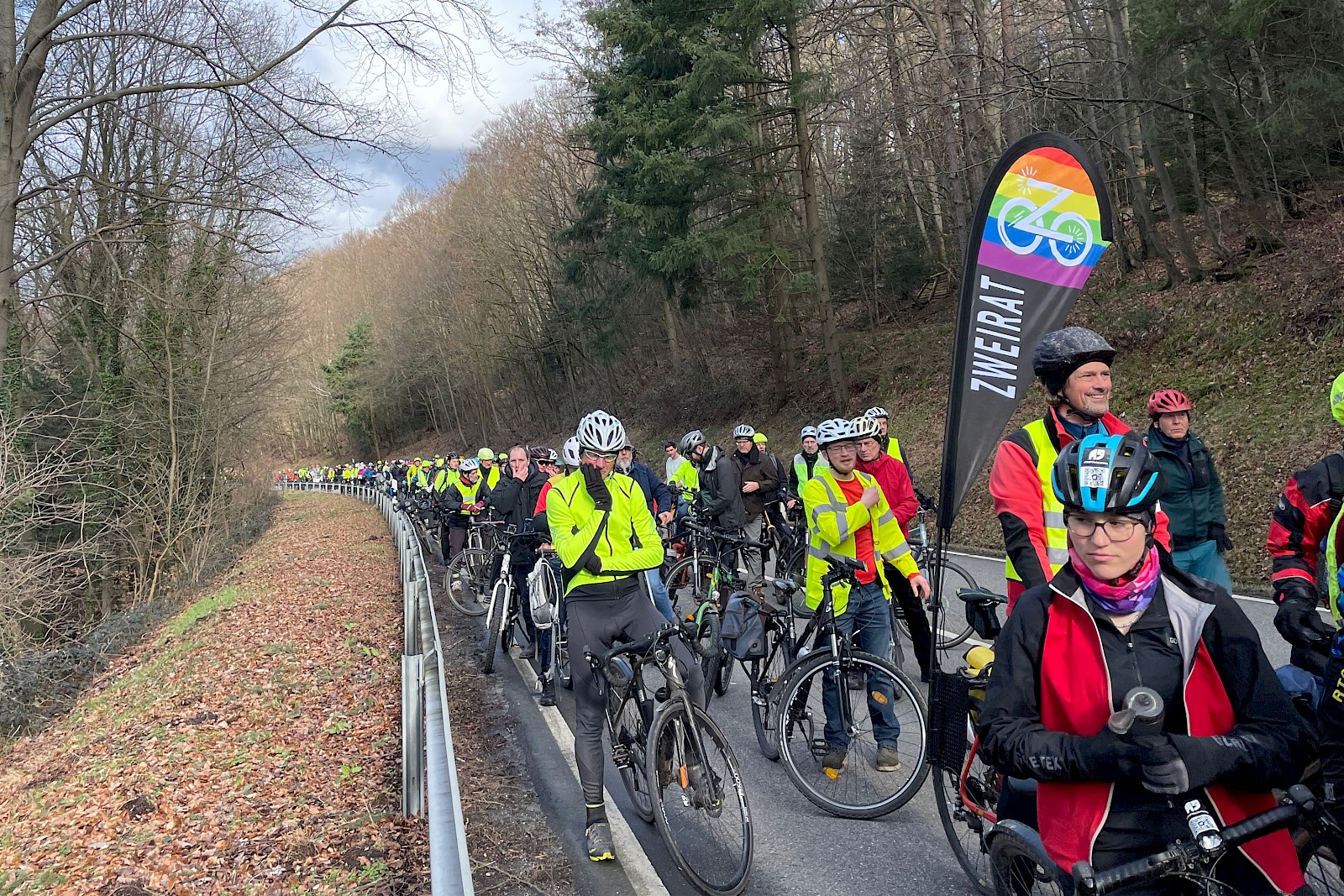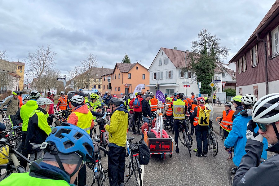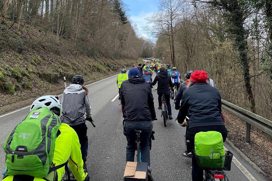 Beginnend in Stuttgart-Vaihingen gab es bereits eine „Zubringer-Demo“ nach Pforzheim. Dieser schloss ich mich gegen 8:10 Uhr in Renningen an. Nach einer Pause in Weil der Stadt und weiteren Personen, die sich dort – hauptsächlich – von der S-Bahn kommend der Demonstration anschlossen, waren wir bereits 90 Personen. Von der Polizei begleitet ging die Fahrt durch das Würmtal nach Pforzheim. Der Fahrer des Polizei-Motorrads lies sich beim sperren von Zufahrten gern von Teilnehmenden der Demo ablösen / unterstützen.
