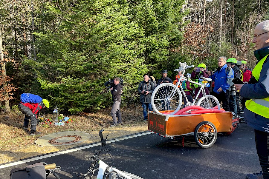 Während ich diese Zeilen schreib – am Tag nach der Demonstration – bin ich unglaublich wütend. Nicht nur über die Unnötigkeit des Todes von Natenom, sondern auch sehr stark darüber, dass die Gedenkstätte bereits verwüstet wurde. ADFC Pforzheim-Enzkreis und die Critical Mass Pforzheim haben gemeinsam mit weiteren Partnern Anzeige erstattet und die Polizei hat die Ermittlungen wegen Störung der Totenruhe eingeleitet. Nach der Spurensicherung seitens der Polizei wurde die Gedenkstätte wieder hergerichtet.