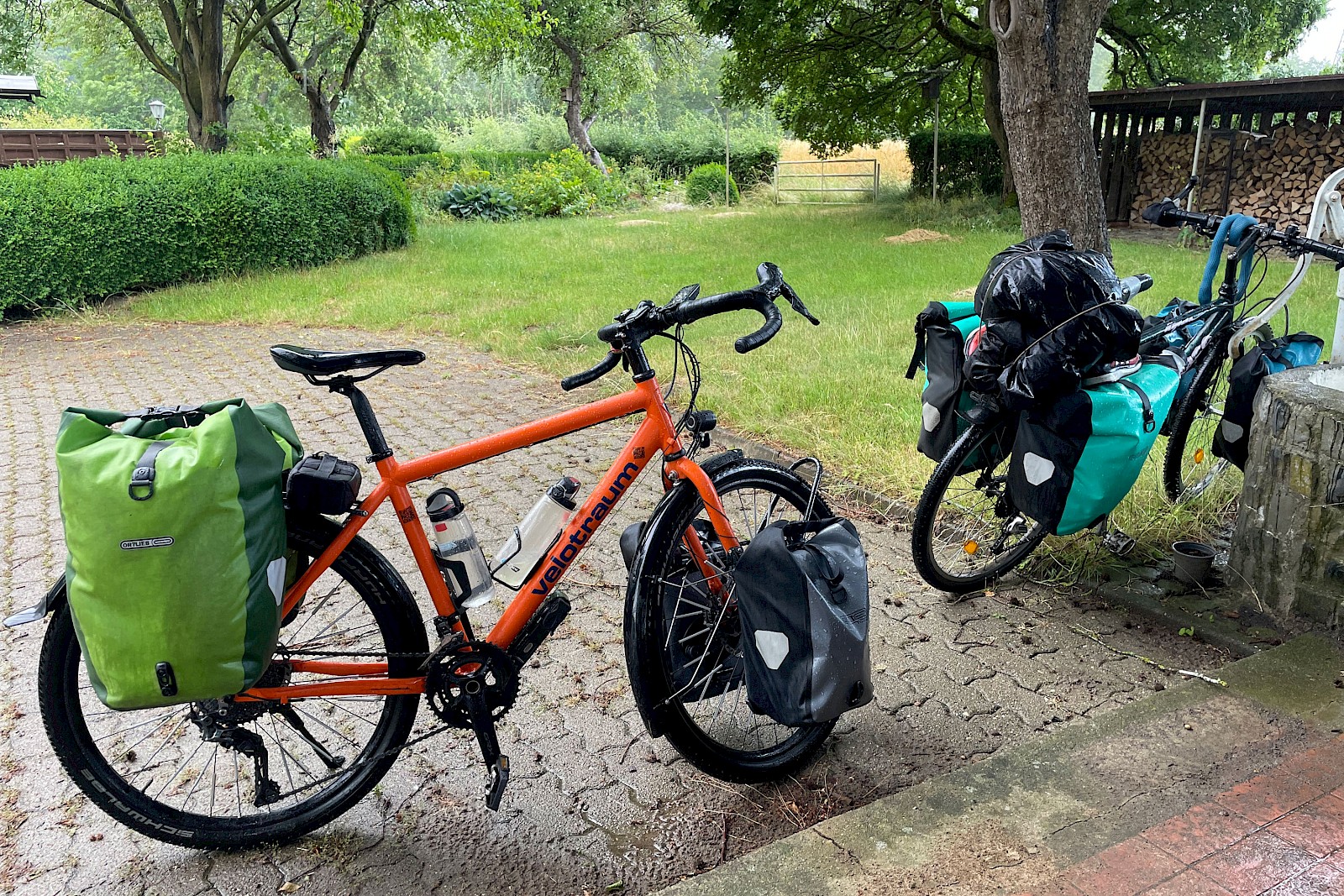 Das Nervigere waren jedoch die Plattfüße – hinten waren es sieben und vorne zwei… Reifen: Schwalbe Hurricane in der Performance-Variante. Da habe ich mir mehrfach ungeschickt Scherben und Steinchen in die Reifen gefahren, die zum Teil das Innenleben des Reifens in Richtung Schlauch gedrückt haben. Ich bin dann früher oder später dazu übergegangen, die betreffenden Stellen im Mantel zu tapen. In Bremen hatte ich dann aber genug und habe mir beim Velotraumpartner „Speiche“ den Schwalbe Hurricane in der Greenguard-Variante mit wesentlich besserem Pannenschutz geholt. Seither ist am Hinterrad Ruhe. Die beiden vorderen Plattfüße kamen erst, als ich Bremen bereits weit hinter mir gelassen hatte. Vom Profil her finde ich den Reifen jedoch sehr gut und bin zufrieden damit. Der mittlere Steg des Reifens ermöglicht ein leichtgängiges Geradeaus rollen auf Asphalt. Mit den noppigeren Bereichen des Reifens ist es aber auch kein Problem, wenn mal kein Asphalt unter den Reifen ist. Daher ist mein Gesamtfazit zum Schwalbe Hurricane: Ein super Reifen, wenn er in der Greenguard-Variante gefahren wird, auch wenn diese ca. 200 Gramm mehr wiegt.