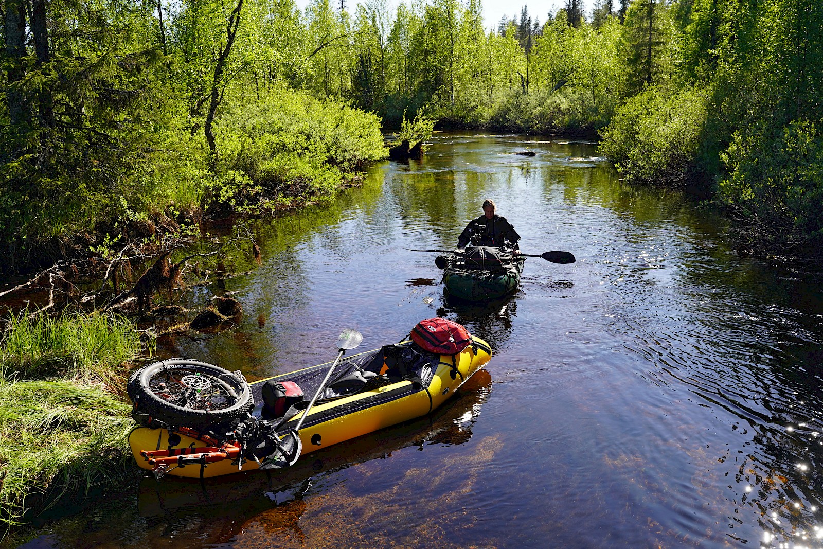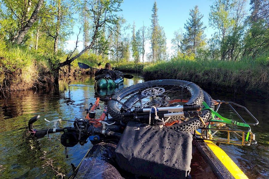 Wir packten unsere »Packrafts« (aufblasbare Leichtboote, Gewichte um die 4,5kg) auf unsere Fahrräder, um dann einige schöne Trails entlang des Flusses hinauf zu radeln, um dann die Fahrräder auf das Packraft zu packen und den Fluss hinunter zu paddeln.
