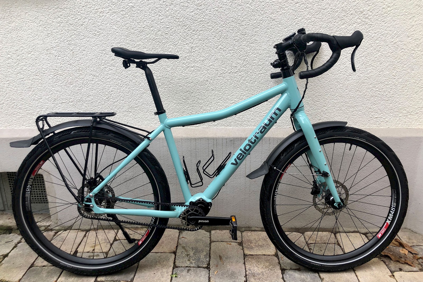 Nach anfänglichen, dauerhaften und ungewöhnlichen Problemen mit dem Pinion-Getriebe (inzwischen hat Pinion einen Austausch der Schaltmechanik am zuvor ausgebauten Getriebe vorgenommen), ist nun Dank des hervorragenden Einsatzes des Velotraum-Werkstattteams (ganz besonderer Dank an Moritz Pfrengle und Petr Haslar) alles perfekt, und das Bike ist inzwischen auch von den »Jungs« in der Werkstatt leicht modifiziert worden: kurze Schutzbleche à la Guido Merkle ;-)
