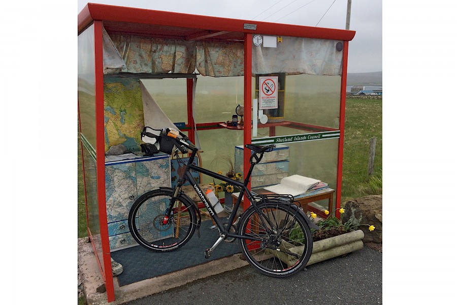 Die berühmte Bushaltestelle auf Unst/Shetlands. Aufgenommen während unserer Pfingsttour 2016. Es gibt ein Gästebuch, wo man sich eintragen kann, eine Bibliothek sowie ein paar Landkarten, um von der großen, weiten Welt zu träumen. Manchmal kommt sogar ein Bus vorbei…. Sicher ist, dass man hier “away from it all” ist.