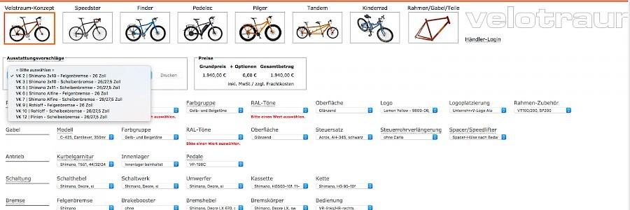 Intime Kenner der Fahrradtechnik, die über ein gewisses Expertenwissen verfügen, können sich ihr Rad mit unserem Velotraum-Konfigurator zusammenstellen. Hier finden Sie nicht nur zusätzliche Wahlmöglichkeiten, sondern auch stets die aktuellen Preise*.