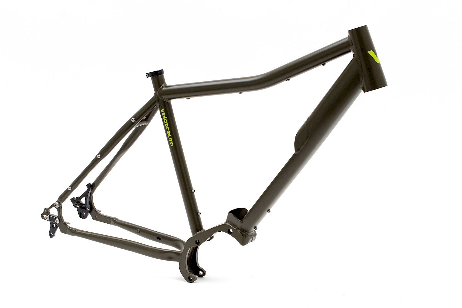 Der dafür eigens entwickelte E900-Rahmen ist eine sehr aufwendige Rahmenplattform, bei der es uns gelungen ist, die Anforderungen des Antriebssystems und die Velotraum-Fahrrad-DNA, also Fahreigenschaften, Passform und Vielseitigkeit unter einen Hut zu bekommen. Unumgänglich war dazu ein komplett neues sowie sehr umfassendes Rahmendesign. Nur so konnten wir optimale Lösungen für die Ausbildung und Lage der Motoren-Aufnahme (Interface), die innen verlaufenden Bus-Kabel und die Position des Akkus realisieren.