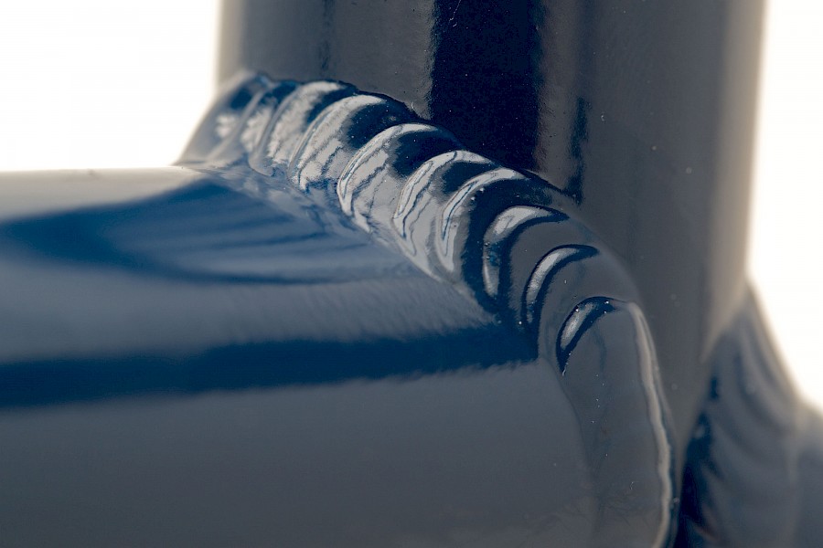 Um zum Beispiel das 40-Millimeter-Oberrohr optimal an das Sitzrohr anschweißen zu können, hat unser speziell gedrehtes Sitzrohr im Fügebereich einen Durchmesser von 37,0 statt der üblichen 34,9 Millimeter. Ober- und Unterrohr weisen im hoch belasteten Steuerrohrbereich vergrößerte Wandstärken auf (2,0 bis 2,3 Millimeter). Das bringt zwar einen hohen Aufwand bei der Rohrfertigung mit sich, steigert aber die Lenkkopfsteifigkeit. Besonders raffiniert und elegant – ein unsichtbares Gusset (Aluprofil) verstärkt die Verbindung von Unter- und Steuerrohr.