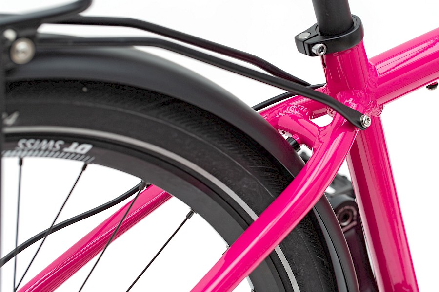Der letzte Punkt war dabei von zentraler Bedeutung, denn nichts ist unangenehmer, als beim plötzlichen Anhalten mit den Weichteilen auf dem Oberrohr zu landen. Da wir an der steifen Diamant(Herren )-Rahmenform festhalten wollten, musste das Oberrohr, mittels elegantem Bogen, kräftig abtauchen. Dabei galt es ein Maß zu finden, das sowohl eine Trinkflaschenhalterung ermöglicht und dennoch gut 60 Millimeter mehr Schrittfreiheit als mit einem geraden Oberrohr.