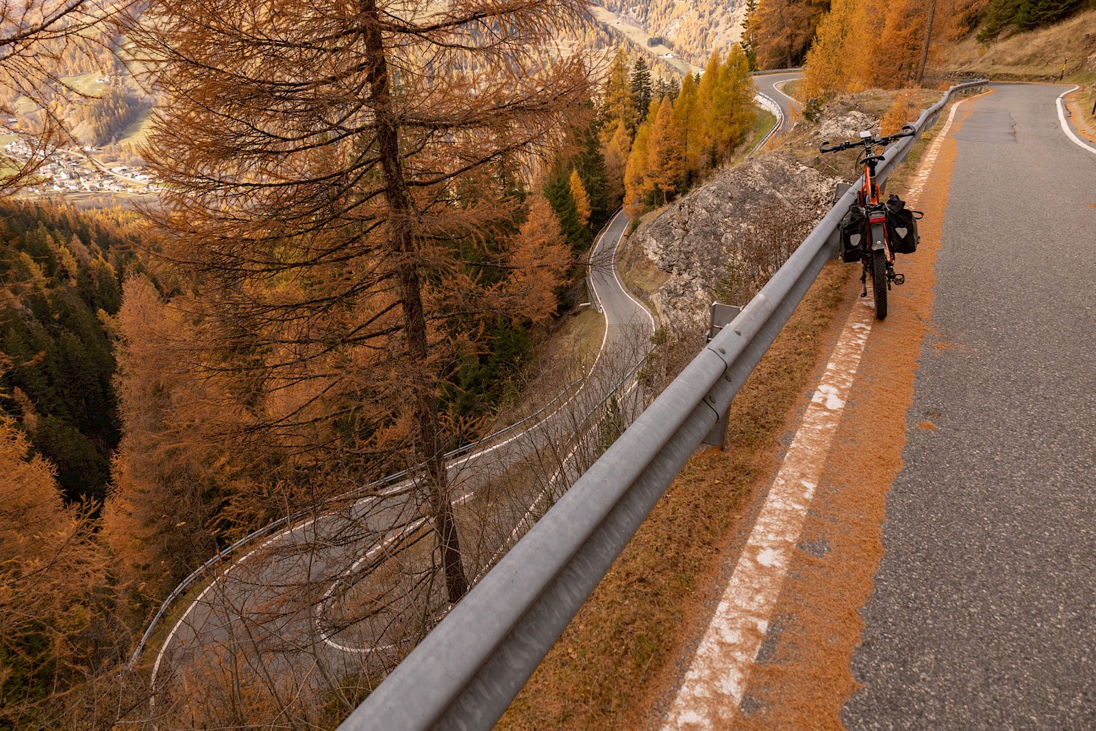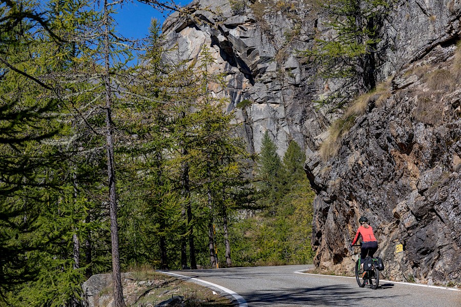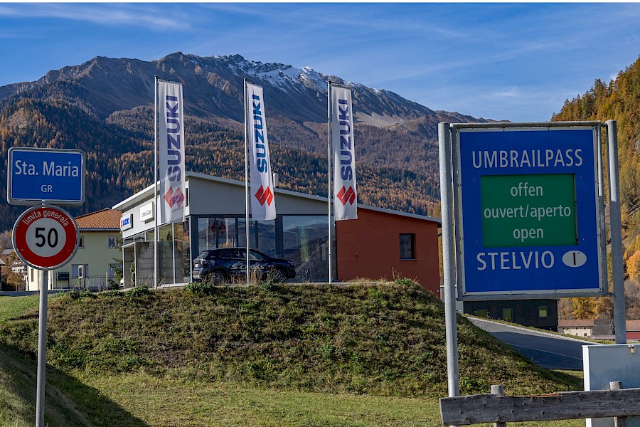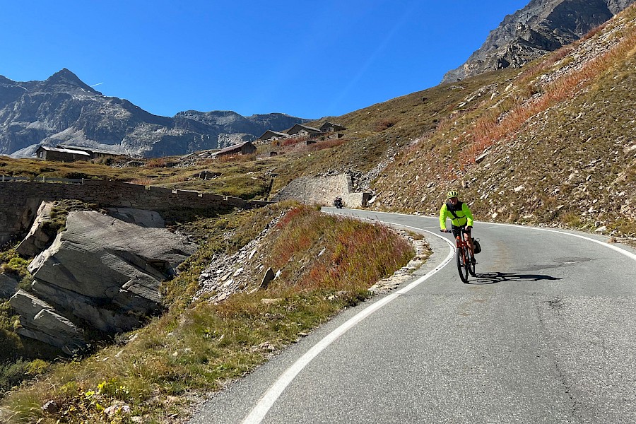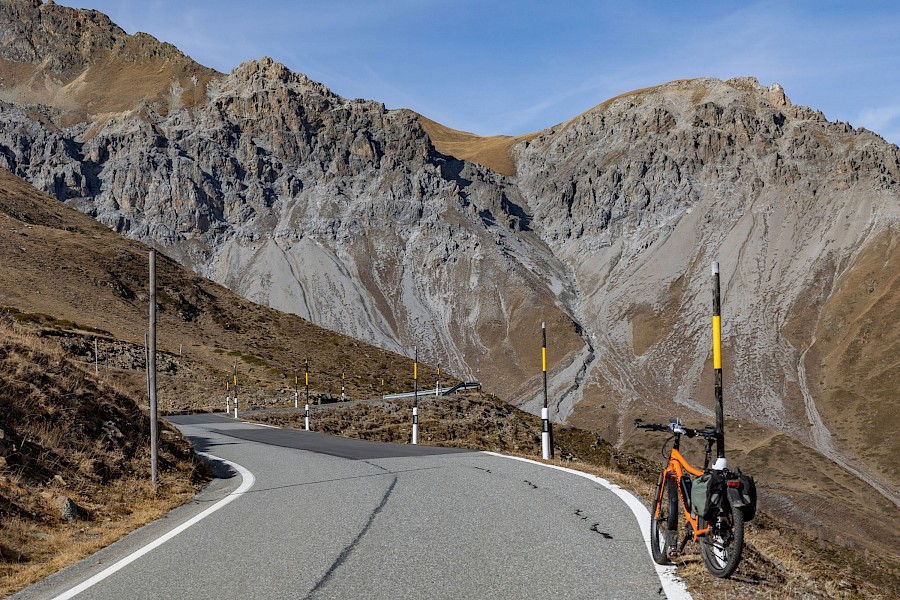 Zunächst zögerte ich, denn das Wetter war zu wechselhaft, und in den Nächten gab es bereits Frost. Außerdem war ich für solche Höhen auch nicht ausgerüstet, hatte also nicht die entsprechende Bekleidung dabei. Am 2. November strahlte die Sonne aber so verführerisch von einem tiefblauen Himmel, dass ich mich zumindest am Umbrail versuchen wollte. Zum Umbrail-Pass war nicht nur die Anfahrt kürzer, er war auch gut 250 Höhenmeter tiefer als der »Stelvio«, was obenraus durchaus einen Unterschied machen kann. Eingedenk unserer Piemont-Erfahrungen und in Anbetracht der mindestens 1.600 Höhenmeter sowie Temperaturen um den Gefrierpunkt stopfte ich den Ersatzakku und warme Radklamotten in die Ortliebtaschen.