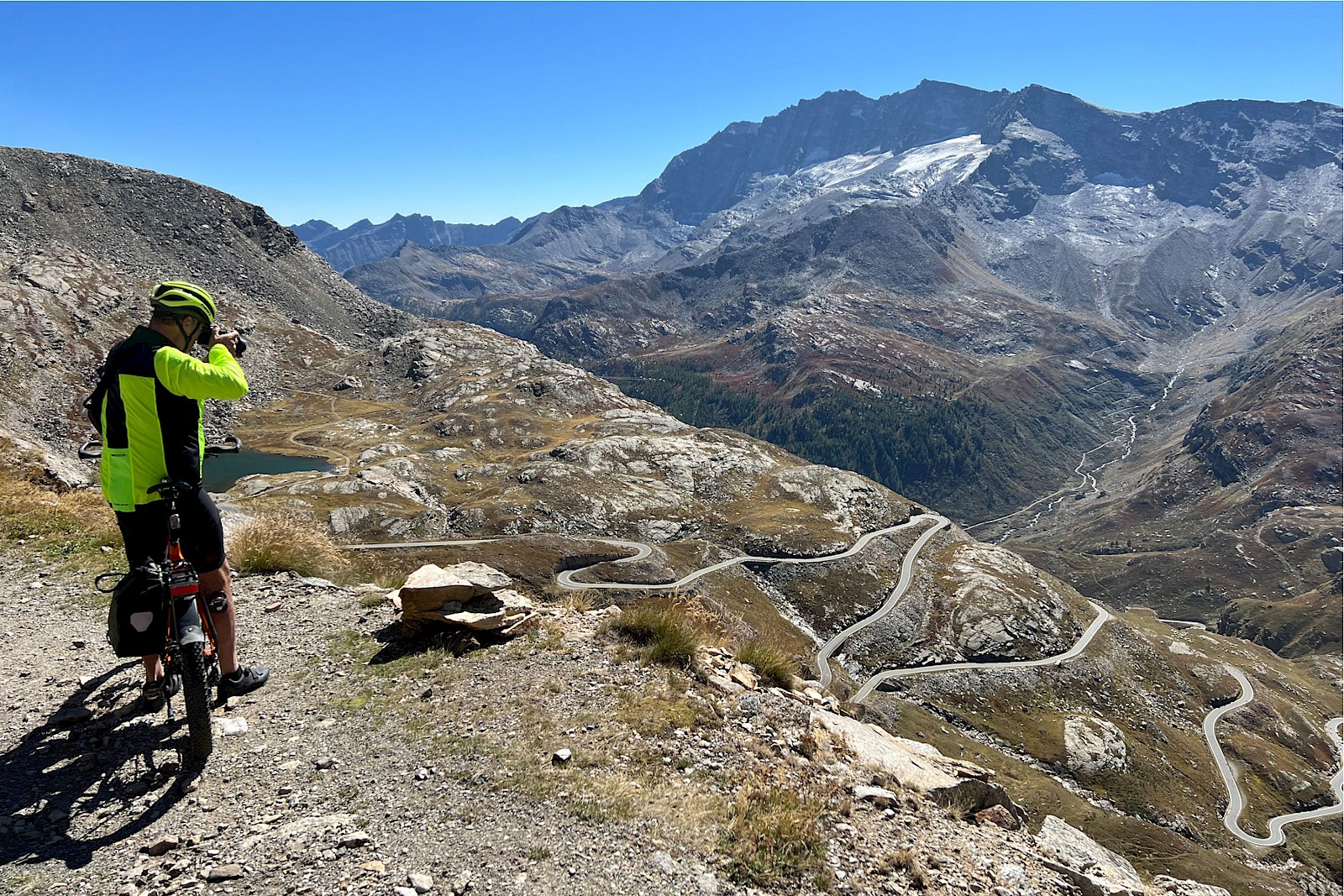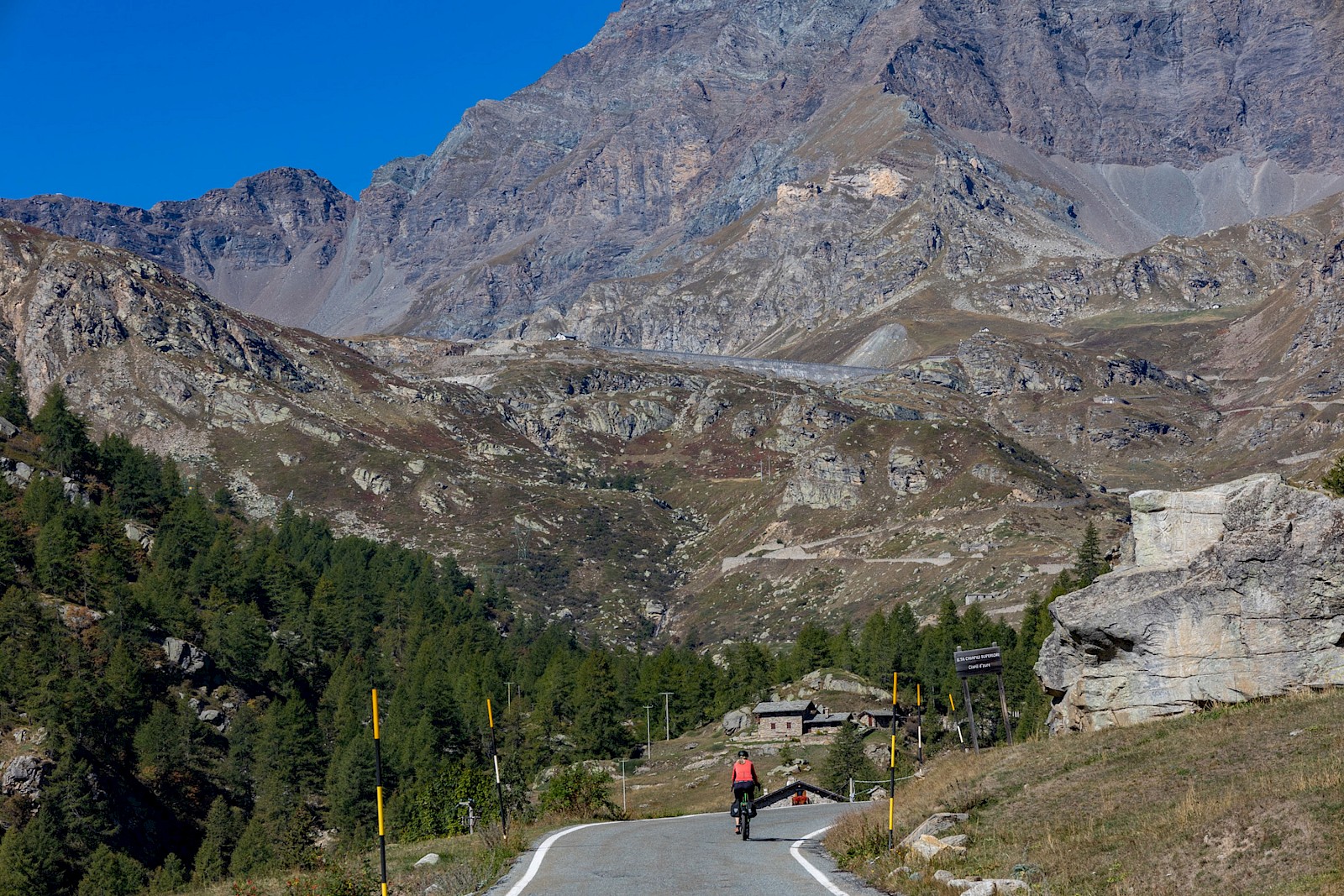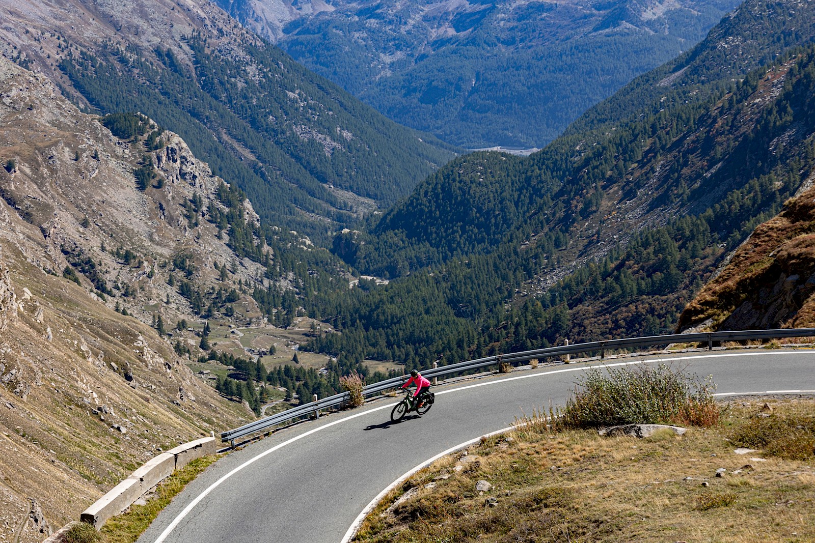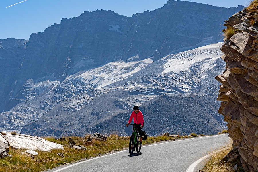 Was für eine Binsenweisheit, doch merkwürdigerweise verliert dieses überschaubare Prozedere – rauf fahren, Aussicht und Endorphine genießen, runter sausen – nie seinen Reiz. Schon im Anstieg, beim langsamen Sich-in-die-Höhe-schrauben, bringt jede Kehre, jede Straßenbiegung einen anderen Blickwinkel. Es ist immer wieder grandios zu erleben, wie sich mit dem Anstieg Landschaft und Vegetation ändern. Ganz großes Kino wird dann oberhalb der Baumgrenze geboten, wenn man mit dem Fahrrad in hochalpine Bereiche vordringt und man von einer grandiosen Bergriesen-Szenerie umgeben ist. Diese Höhen und Regionen aus eigener Kraft erreicht zu haben, ist einfach ein unbeschreiblich erhabenes und süchtig machendes Gefühl. Anderseits fühlt man sich im Angesicht der Bergriesen und Naturgewalten so unendlich klein und verwundbar – Pässe fahren ist eben auch eine herrliche emotionale Achterbahnfahrt.