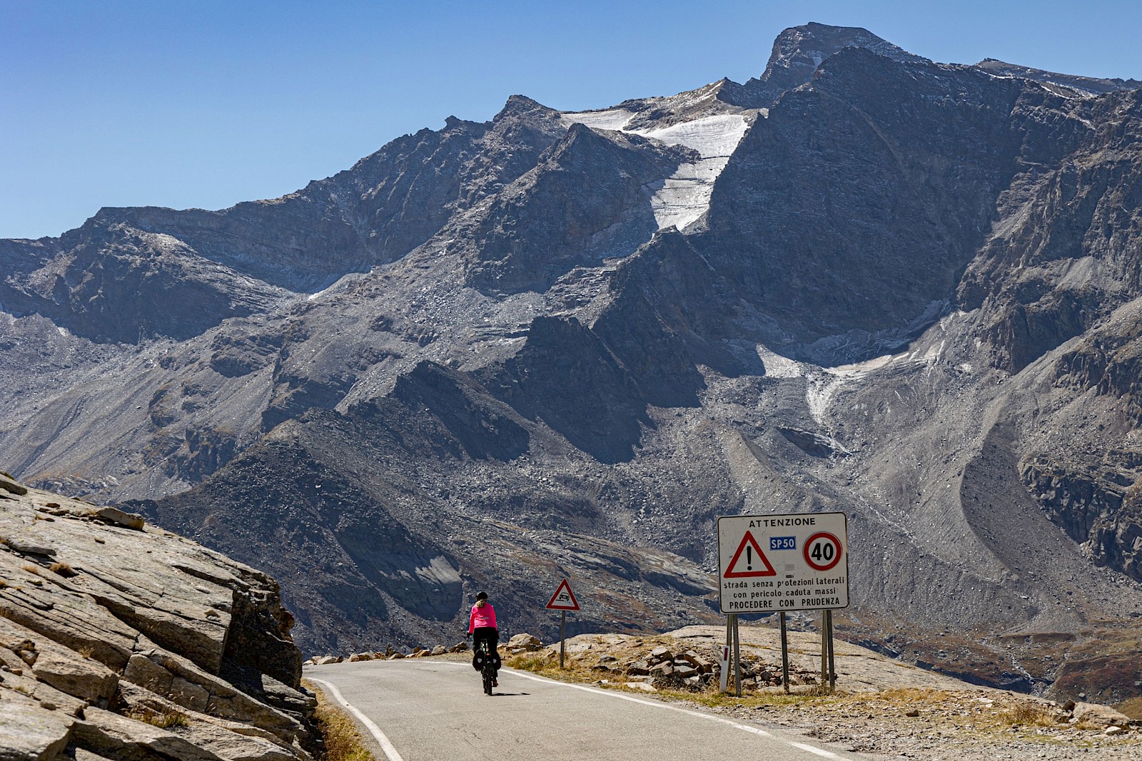- Wer ungern in einer Blechlawine radelt, sollte verkehrsarme Jahres- oder Tageszeiten wählen oder auf unbekannte, kleine Pässe in touristisch abseits liegenden Regionen ausweichen – Sonntag ist übrigens der ideale Ruhetag für Radreisende, denn da sind oft auch Geheimtipps überlaufen. Bei den ganz hohen Pässen muss man aber speziell im Frühsommer mit Überraschungen in Form von Schneefeldern rechnen.