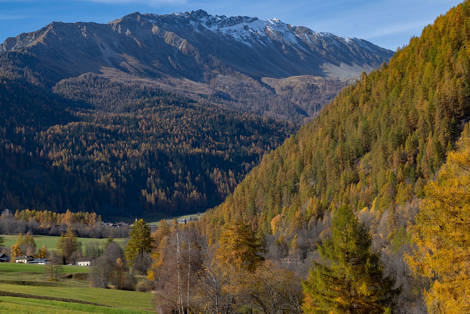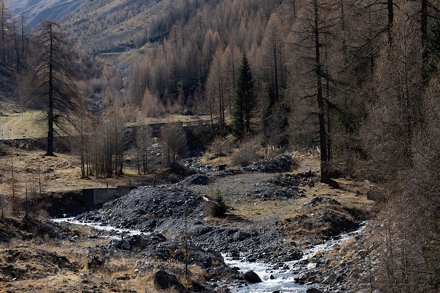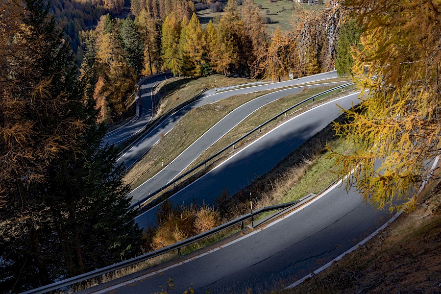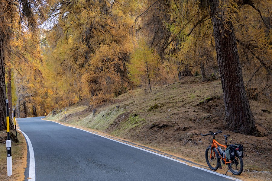 Schon wenige hundert Meter die Passhöhe hinauf tauchte ich in betörend schöne Lärchenwälder mit wunderschöner Herbstfärbung ein. Auch die Passstraße selbst ist schlicht grandios: schmal, wunderschön geführt und tipp-topp in Ordnung – Schweiz halt! Zudem hatte ich die Straße und die landschaftliche Herbstsinfonie für mich allein, denn nur eine handvoll Autos und ein Radfahrer sollten mir bis zur Passhöhe begegnen – Die Gunst der späten Jahreszeit.