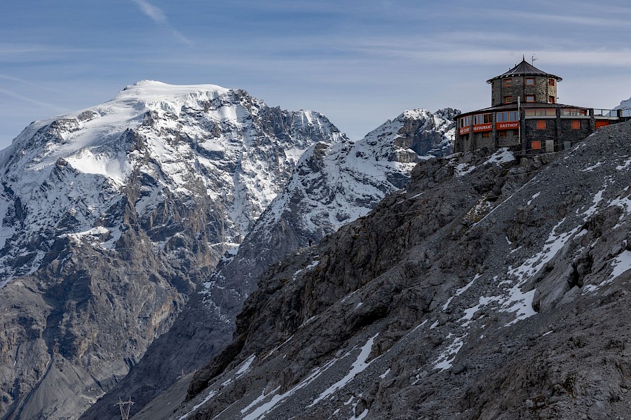 Doch auch die letzten 250 Höhenmeter wollen erstmal gefahren sein, zumal der Anstieg vom Umbrail zum Stelvio nicht besonders schön ist und auch vergleichsweise viel Verkehr herrschte. Kurzum, die zehn Kehren hinauf zur Passhöhe waren erstmals auf der Tour quälend-zäh. Oben angekommen, war ich völlig perplex, wie man eine Passhöhe – noch dazu in einem Nationalpark – so verunstalten kann. Zumal es im Vinschgau eine überraschend hohe Anzahl an Qualitätsarchitektur zu entdecken gibt, wie man das sonst nur von der Schweiz kennt. Ich suchte mir so schnell wie möglich eine sonnige, windgeschützte und abgelegene Ecke, um mich zu sammeln, auszuruhen und Kalorien zu bunkern. Dann ging es bei sich eintrübendem Wetter die gleiche Strecke wieder zurück, die in der Gegenrichtung neue Facetten entfaltet.
