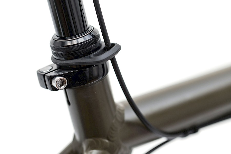 Die D.2ST gibt es für innen (D.2ST-Ri) oder außen liegenden (D.2ST-Ro) Bowdenzug; wir verwenden die Ro-Variante. Hintergrund: Zugunsten der Strapazierfähigkeit verzichten wir bei unseren Rahmen auf alle nicht essentiell notwendigen Bohrungen und Öffnungen. Da bei allen Velotraum-Rahmen am Oberrohr ein bis drei Bowdenzüge verlegt werden können, lässt sich der Bowdenzug der D.2ST-Ro elegant und funktional einwandfrei verlegen.
