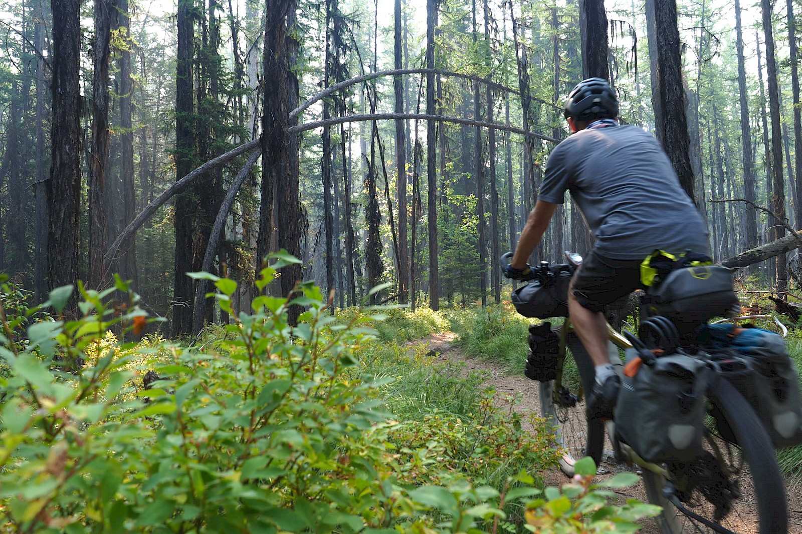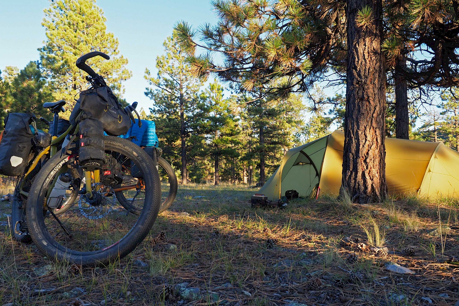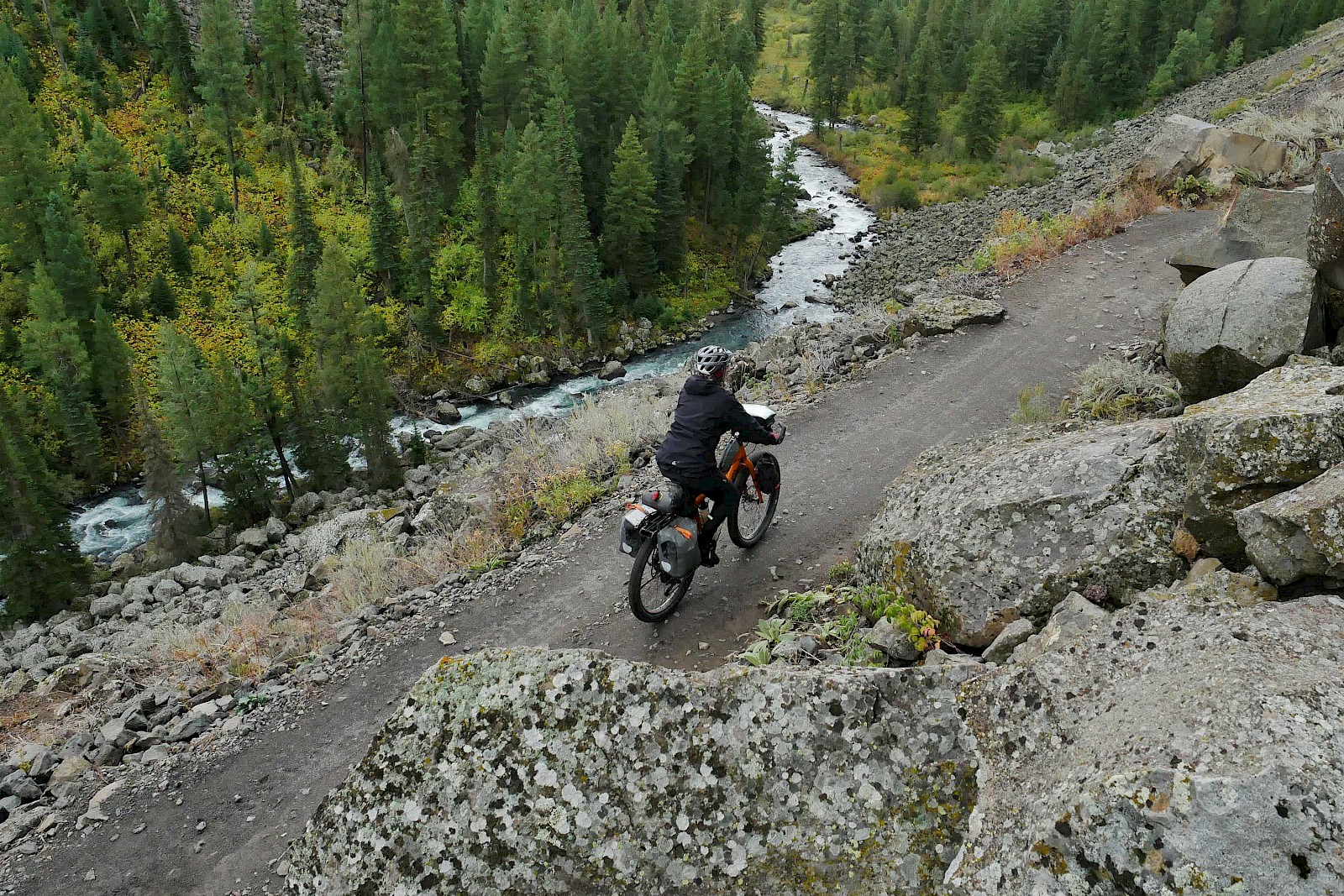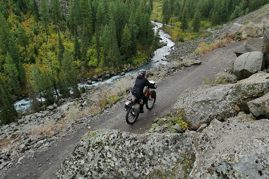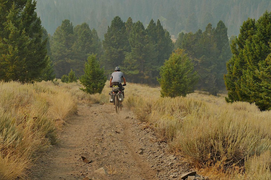 Fast ausschließlich auf einsamen Forststraßen und einigen herausfordernden Trail-Passagen geht es in sieben Tagesetappen bis zur Grenze in die USA, wo wir aufgrund der verheerenden Waldbrände in Montana einige Umwege nehmen müssen. Nach einem Monat „Schönwetter-Radeln“ erreicht uns im Yellowstone Nationalpark schließlich ein viel zu früher Gruß des Winters. Gerade noch radeln wir im kurzen Shirt durch die Rauchwolken der mächtigen Waldfeuer in Montana, schon tragen wir alle Klamotten, die wir in den Taschen haben und kämpfen gegen den viel zu frühen Wintereinbruch in Idaho und Wyoming. Eine neue Herausforderung für unsere FINDER! Drei Wochen lang kämpfen wir mit Nassschnee, verschlammten Pisten und Regen. Viel Regen. Unsere FINDER stoßen teilweise an ihre Grenzen, was aber angesichts der teils miserablen Bedingungen kein Minuspunkt sein soll. Selbst mit einem ausgewachsenen Fatbike wäre hier oft Schluss gewesen!