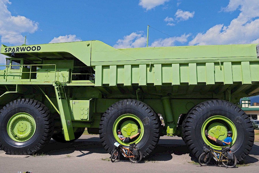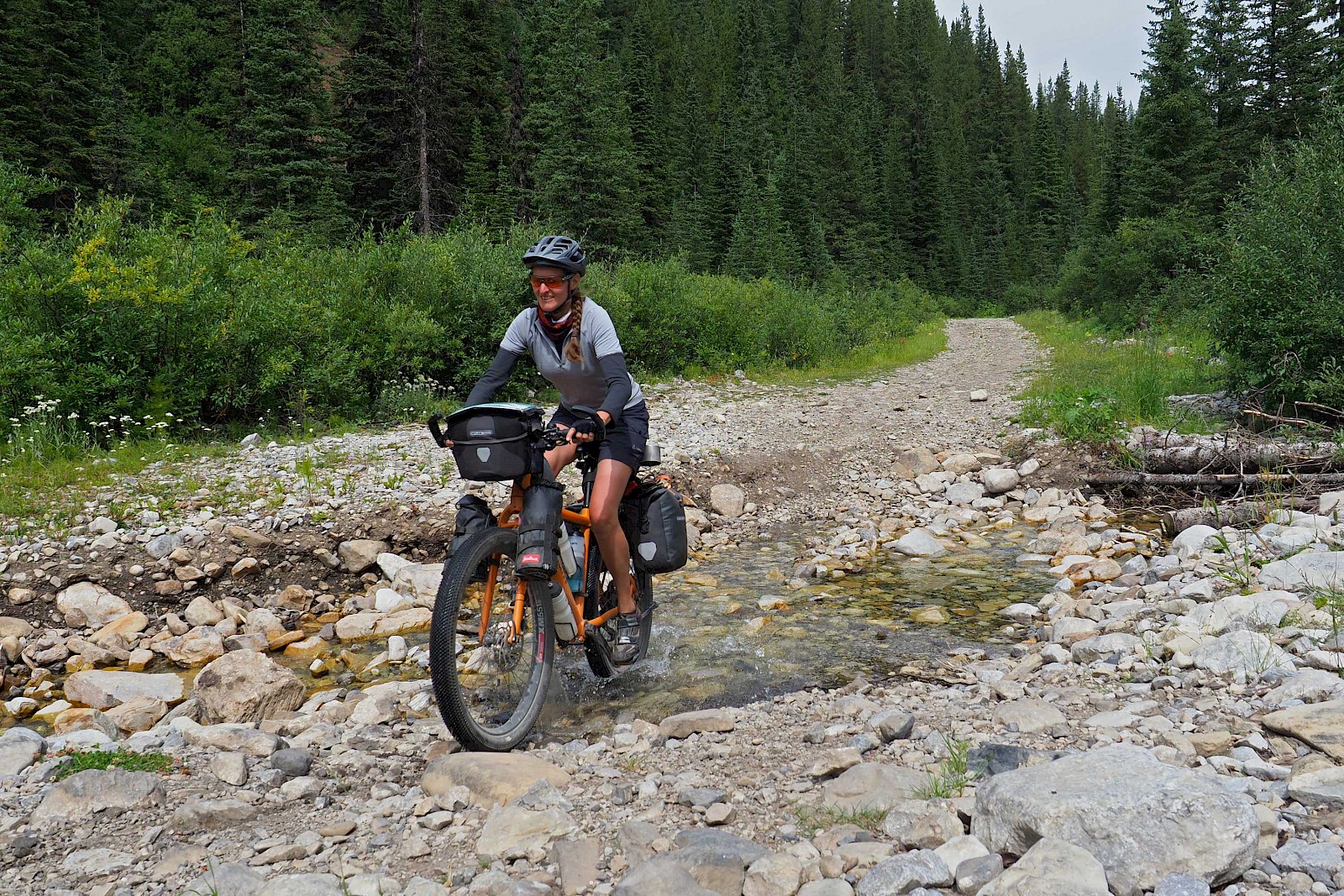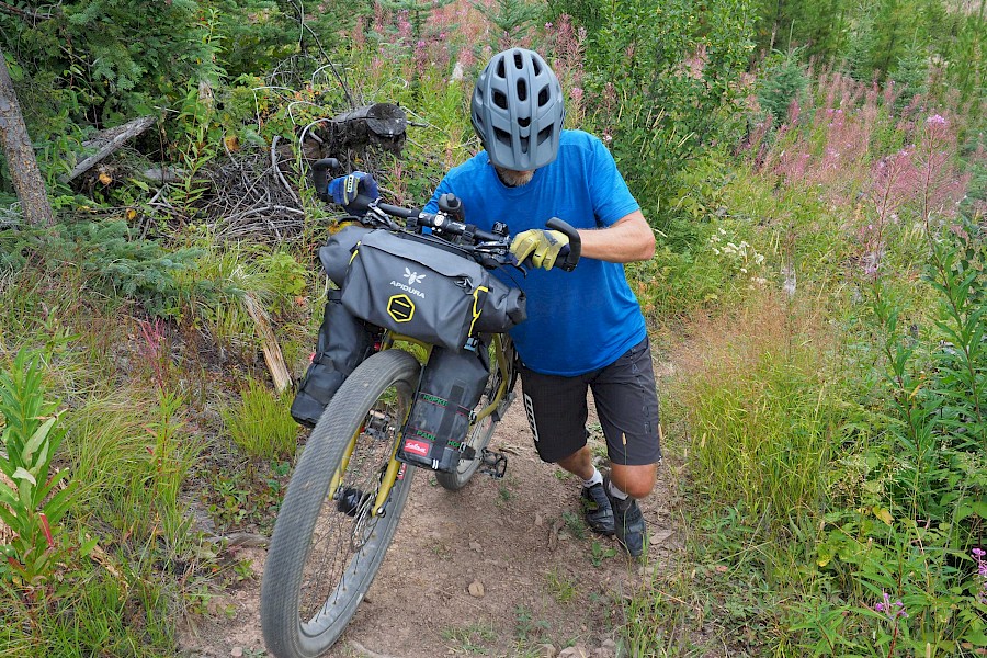 Nach ein paar gemütlichen „Einradel-Tagen“ auf dem Icefields Parkway, einer der schönsten Fernstraßen der Welt, starten wir am 16. August voller Vorfreude und etwas nervös in unser neues Abenteuer. Hinter dem alten Banff Springs Hotel führt ein unscheinbarer Schotterweg hinein in die faszinierende Wildnis Kanadas. Die ersten Kilometer abseits des Asphalts fühlen sich dank unserer FINDER hervorragend an! Sanft bügeln die 2,8 Zoll breiten Reifen die kleinen Unebenheiten und den Schotter aus – ein riesiger Komfortgewinn im Vergleich zu unseren alten Reiserädern! Was uns auch sofort auffällt, ist der enorme Sicherheits-Gewinn in Kurven und bei rasanten Abfahrten – man fühlt sich fast wie auf Schienen! Voraussetzung für ein ausgewogenes Fahrverhalten ist auf jeden Fall der Luftdruck unserer 2,8 Zoll G-One Tubeless-Reifen von Schwalbe. Während wir auf Schotter mit etwa einem Bar fahren, pumpen wir bei längeren Asphalt-Passagen 1,5 bis 2 Bar in die Schlappen, was das Abrollverhalten erstaunlich positiv beeinflusst. Gerade auf Asphalt hätten wir das nicht erwartet. Der G-One ist zudem relativ leise und macht so selbst längere Straßenstücke zu einem Genuss. Doch wie bereits erwähnt, entfaltet der FINDER sein volles Potential erst abseits des Asphalts. Möglichkeiten, dies auszukosten, haben wir in den nächsten Wochen auf jeden Fall mehr als genügend.