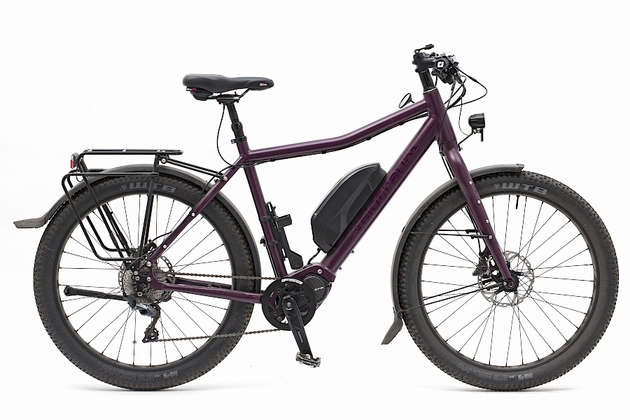 Warum nun das Rücklicht an der Sattelstütze sitzt und nicht am Gepäckträger, hat natürlich seinen Grund. Denn so können mit ein paar Handgriffen die Schutzbleche und der Gepäckträger demontiert werden und Platz für einen fett-bereiften zweiten Laufradsatz geschaffen werden. Dadurch verwandelt sich das brave Nutzrad in ein fetziges Omniterra-Spaßrad. Dabei nutzt Pit geschickt das Potential unterschiedlicher Reifenformate, die im E-Finder möglich sind. Ohne das Schutzblech-Gepäckträger-Gedöns beträgt das Gewicht knapp über 20 Kilogramm – mit dem kleinen Akku (520 Wh) ließe sich gar die magische 20-Kilogramm-Marke unterbieten.