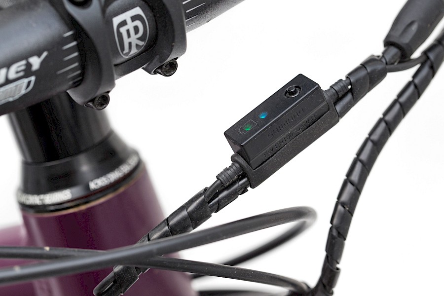Wohl überlegt war auch die Entscheidung für den »alten« FD100E-Rahmen mit aufgesetztem Akku. Ausschlag gebend dafür waren sowohl die Verfügbarkeit als auch die klassische Rahmenoptik. Als Laufradsatz kommt eine Kombination aus WTB-Felgen und 2,8-Zoll WTB-Reifen zum Einsatz und zwar in 26-Zoll Laufradgröße. Die somit geringere Überstandshöhe kommt insbesondere Moritz’ Frau Ina zugute. Da extreme Berggänge weder gewünscht noch benötigt werden, hat Moritz eine Kassette mit 11-34 Zähnen und ein Rennradschaltwerk mit kurzem Käfig verbaut.