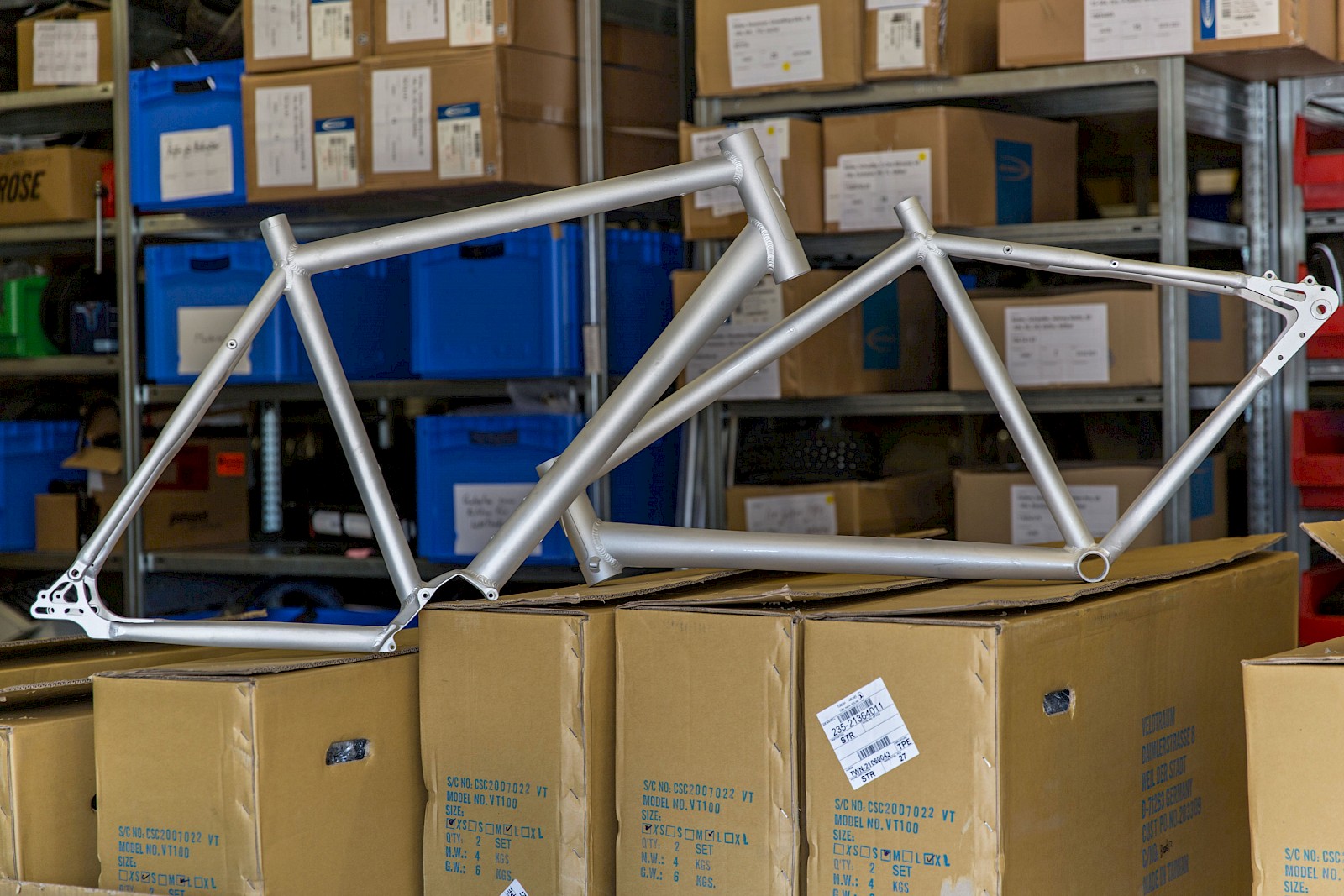 Leider konnten wir nur ein winziges Kontingent der Flugfrachtplätze ergattern (Rest kommt mit dem Schiff), aber immerhin. Den neuen VT100-Rahmen haben wir bereits ausführlich vorgestellt. Für den VT1300-Pinion-Rahmen werden wir das nachholen, sobald ein neues Ausstellungsrad zur Verfügung steht.