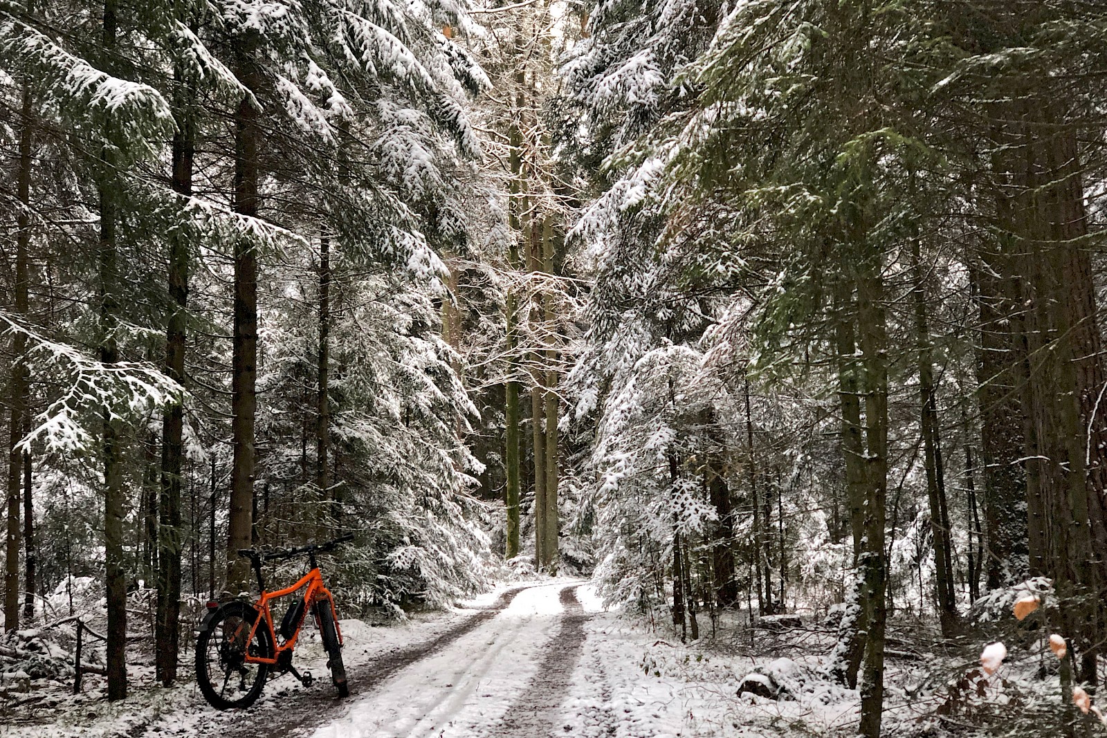 Nun die erste Ausfahrt bei den hier so klassischen Winterbedingungen. Die ersten zwei Kilometer geht es noch auf geräumten Straßen durch den Ort und die wenigen Passanten schauen etwas verdutzt ob meines Kettenfahrzeug-Sounds. Der Antrieb kompensiert dankenswerter Weise schon im Eco-Modus vollständig das höhere Gewicht und den höheren Rollwiderstand.
