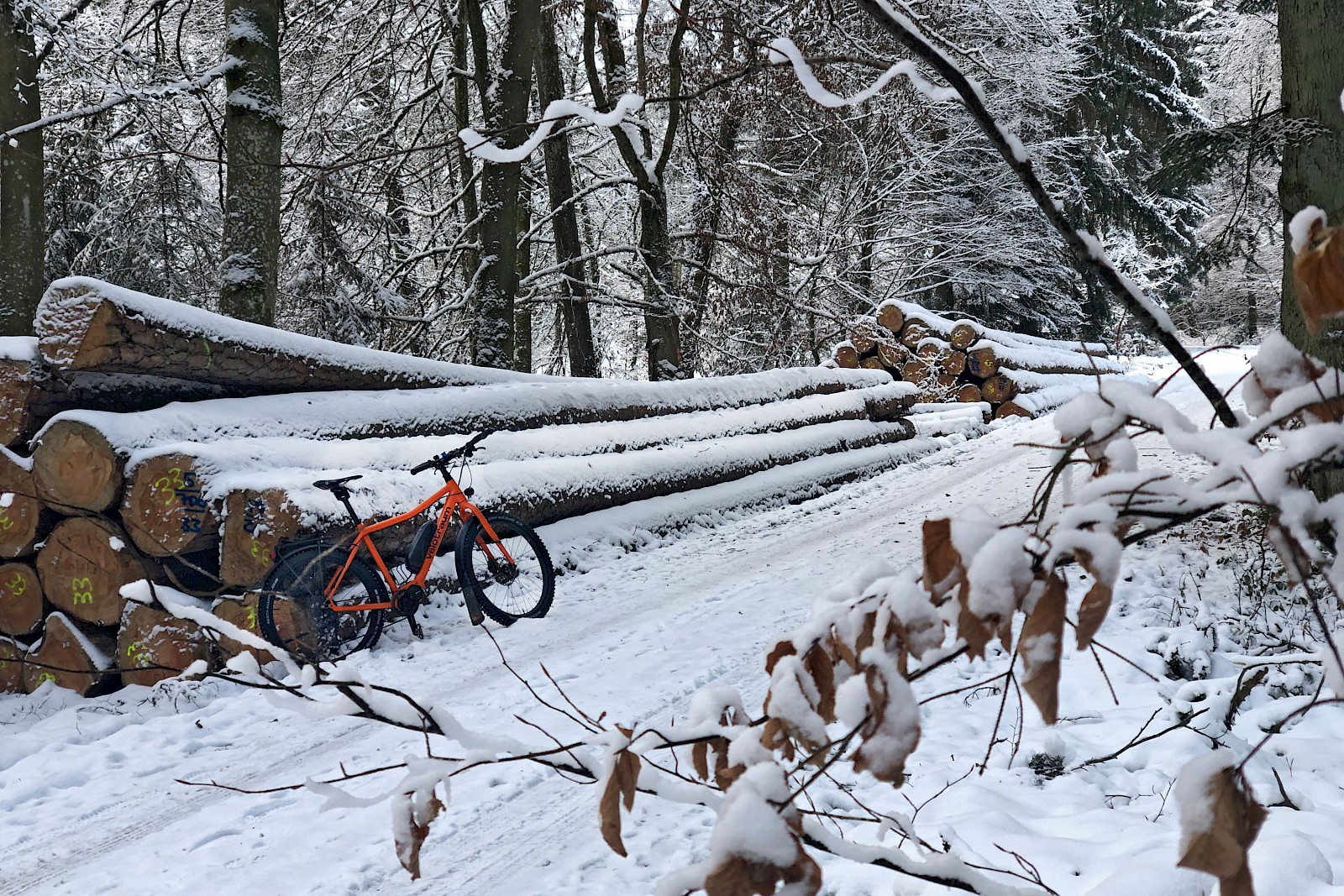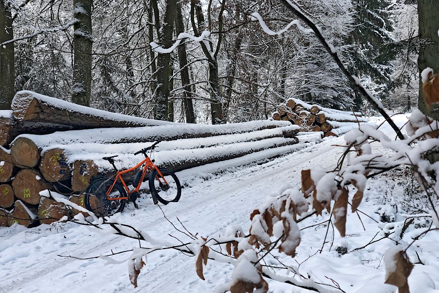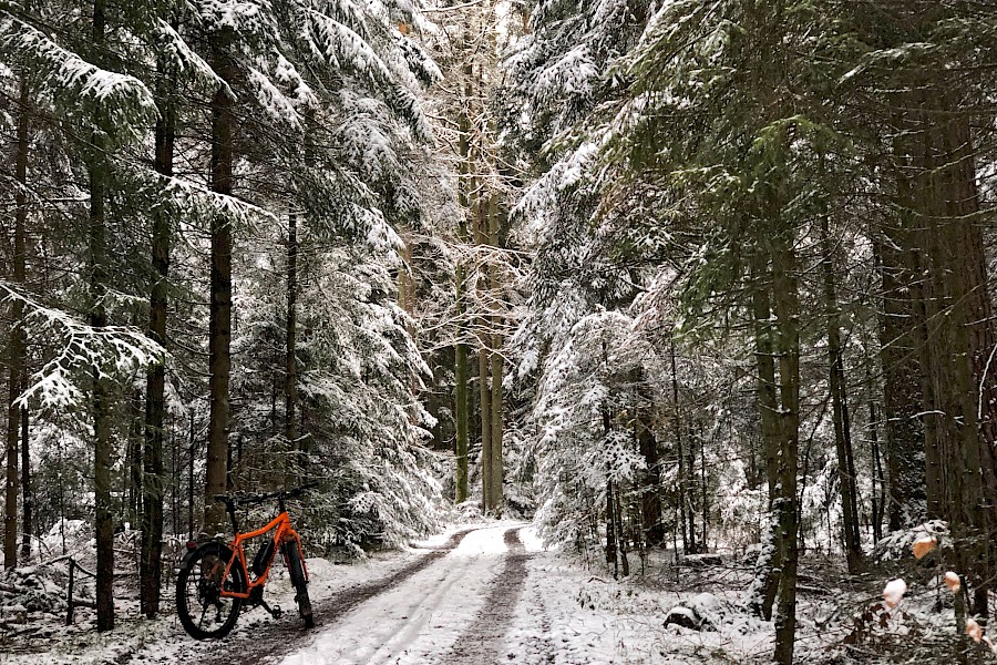 Noch ein paar Worte zu den Asphalteigenschaften, die natürlich recht bescheiden sind. Der Reifen fährt sich leicht kippelig und eiert etwas durch die Kurven. Bei der üppigen Stollenhöhe – die alle Spike-bewehrt sind – ist das aber nicht überraschend. Daher würde ich den Ice-Spiker weniger für das urbane Umfeld empfehlen, es sei denn, man hat Spaß daran seine Mitmenschen zu verblüffen und stört sich nicht an verängstigt-bellenden Hunden. Ich persönlich werde das Asphalt-Gerassel mit stoischer Gelassenheit ertragen (zumal der Steps-EP8-Antrieb den höheren Widerstand verschwinden lässt) und dafür die winterlichen Waldstrecken besonders entspannt genießen ;-)