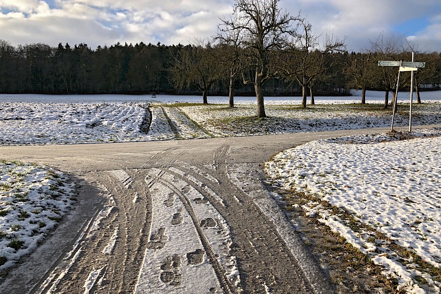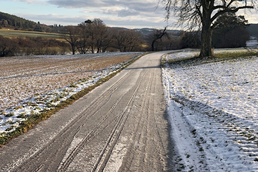 Die Wetterprognose sollte recht behalten. Tauwetter, Schneeregen und strammer Nachtfrost sorgten auf meiner Arbeitsstrecke für eine fast »durchgängige« Eisdecke, von der Haustür bis zum Ende des Radwegs in Weil der Stadt. Ich bin zwar nicht mehr »entspannt« unterwegs gewesen, da fehlte mir unter so extremen Bedingungen doch noch das Vertrauen in und die Erfahrung mit dem Reifen, aber ich bin sicher und ohne einen einzigen Ausrutscher im Betrieb angekommen. Das größte Risiko war das Anhalten und Absteigen um die Bilder zu machen ;-)