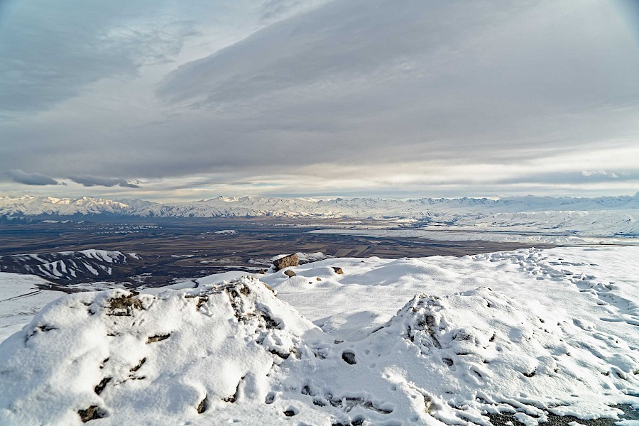 Durch einsame verschneite Landschaft fahre ich am nächsten Tag langsam aber stetig von 2200 Metern über Meeresspiegel wieder auf über 3100 hoch. Oben angekommen hat es eisige minus acht Grad Celsius. Auf der Abfahrt liegt teilweise Eis, teilweise Schnee. Ein guter Moment um meinen »wunderbar breiten« Reifen (Zitat Stefan Stiener ;) ) zu danken. Die Luftfeuchtigkeit meines Atems kondensiert in meinem Bart und gefriert anschließend. Allgemein kann man sagen: es wird unangenehm kalt in Kirgistan.