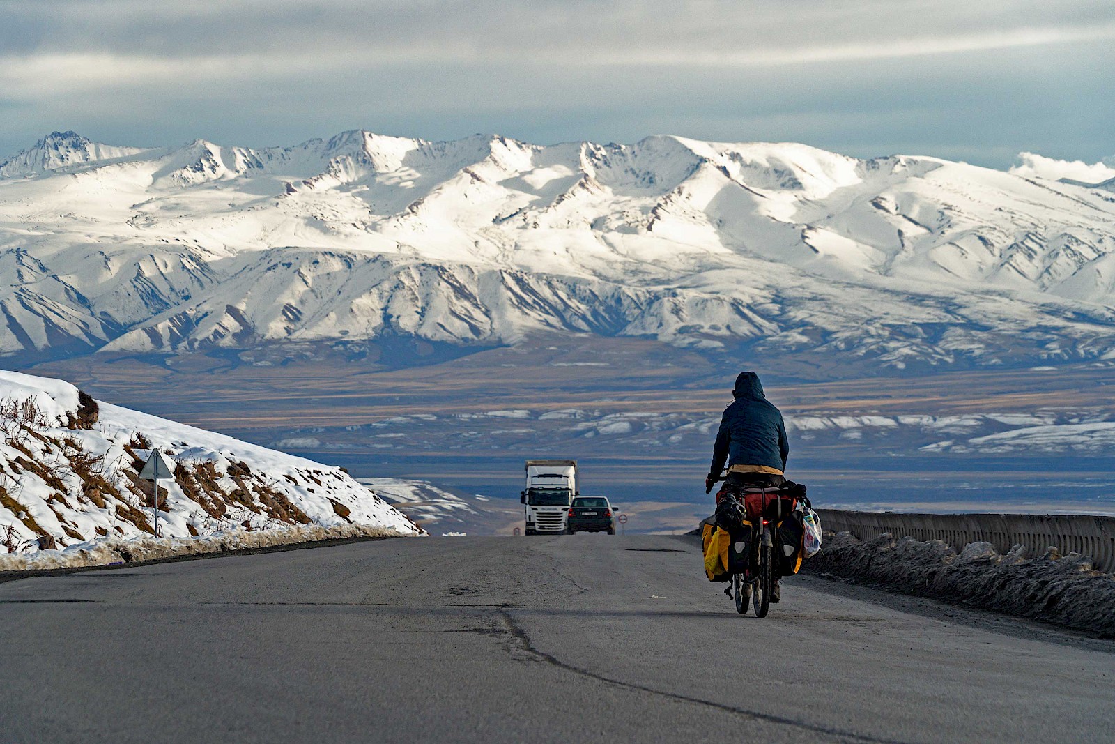 Meiner Erfahrung nach sind die Menschen umso gastfreundschaftlicher umso rauher die Natur beziehungsweise die Landschaft ist. Ein Beispiel dafür sind die kargen lebensfeindlichen Wüstenregionen in Südasien. Auf der 7-tägigen Tour von Bishkek zur Grenze Usbekistans liegen zwar keine Wüstendurchquerungen vor mir, aber kalte Höhenlagen, Schnee und Hochplateaus mit Gegenwind. Ich weiß nicht ob die Leute Mitleid mit mir haben oder interessiert sind oder beides aber ich werde mehrfach zum Abendessen oder zum Übernachten eingeladen, was ich bei den Temperaturen dankend annehme. Auch wenn die Landschaft hier sehr eindrucksvoll ist, so sind es trotzdem die Menschen mit denen ich in Kontakt komme, die mich am meisten auf dieser Reise beeindrucken. Ihre Geschichten, ihre Art zu leben, ihre Sichtweise auf die Welt. Darauf möchte ich aber in einem anderen Beitrag später umfangreich eingehen. Für diese Etappe bleibt zu sagen, dass es enorm fordernd war die ca. 550 Kilometer und 6.300 Höhenmeter unter Zeitdruck und bei diesen Temperaturen zu meistern. Für den Aufwand wurde ich doppelt belohnt und zwar mit Ausblicken die ich auf Fotos gebannt habe und Begegnungen mit Menschen, an die ich in vielen Jahren noch denken werde.