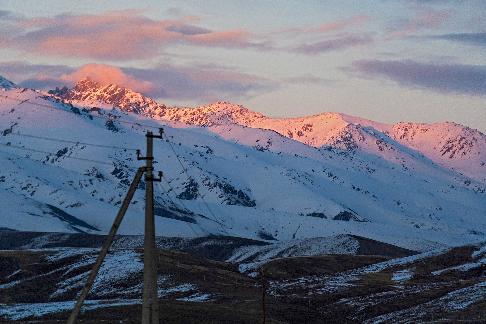 Der kleinste der 14 Gänge meiner Rohloff-Schaltung ist über 2 Tage mein bester Freund und weicht mir nicht von der Seite – bis zum Scheitel des Töö-Passes auf 3.180 Metern über dem Meeresspiegel. Das stimmt nicht ganz. Die letzten drei Kilometer darf ich nicht selber fahren laut Polizei. Vor dem Tunnel am Ende des Passes muss ich anhalten und mit einem Pferde-Transporter mit fahren. Dass es kein normaler LKW ist, sondern ein Pferde-Transporter, ist so typisch Kirgistan, dass es schon wieder lustig ist. Aus dem Tunnel heraus blicke ich über die schöne Abfahrt der Passstrasse ins Suusamyr-Tal. Tschüss erster Gang, hallo größere Übersetzung. Mit der typischen Post-Pass-Euphorie geht es die Abfahrt herunter und in den Sonnenuntergang. Pferde auf Wiesen und Berge, welche der Schnee zu erst weiß und die Sonne anschließend orange färbt. Herrlich. Für morgen steht wieder eine Tour über 3.000 Meter Höhe auf dem Plan, deshalb endet der Tag ziemlich bald nach Sonnenuntergang.