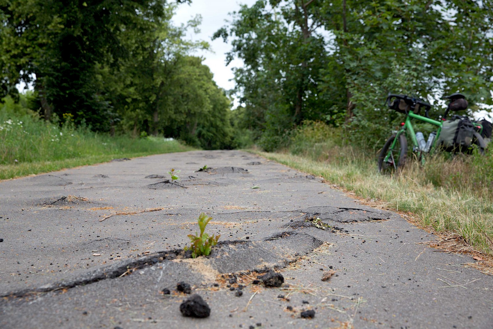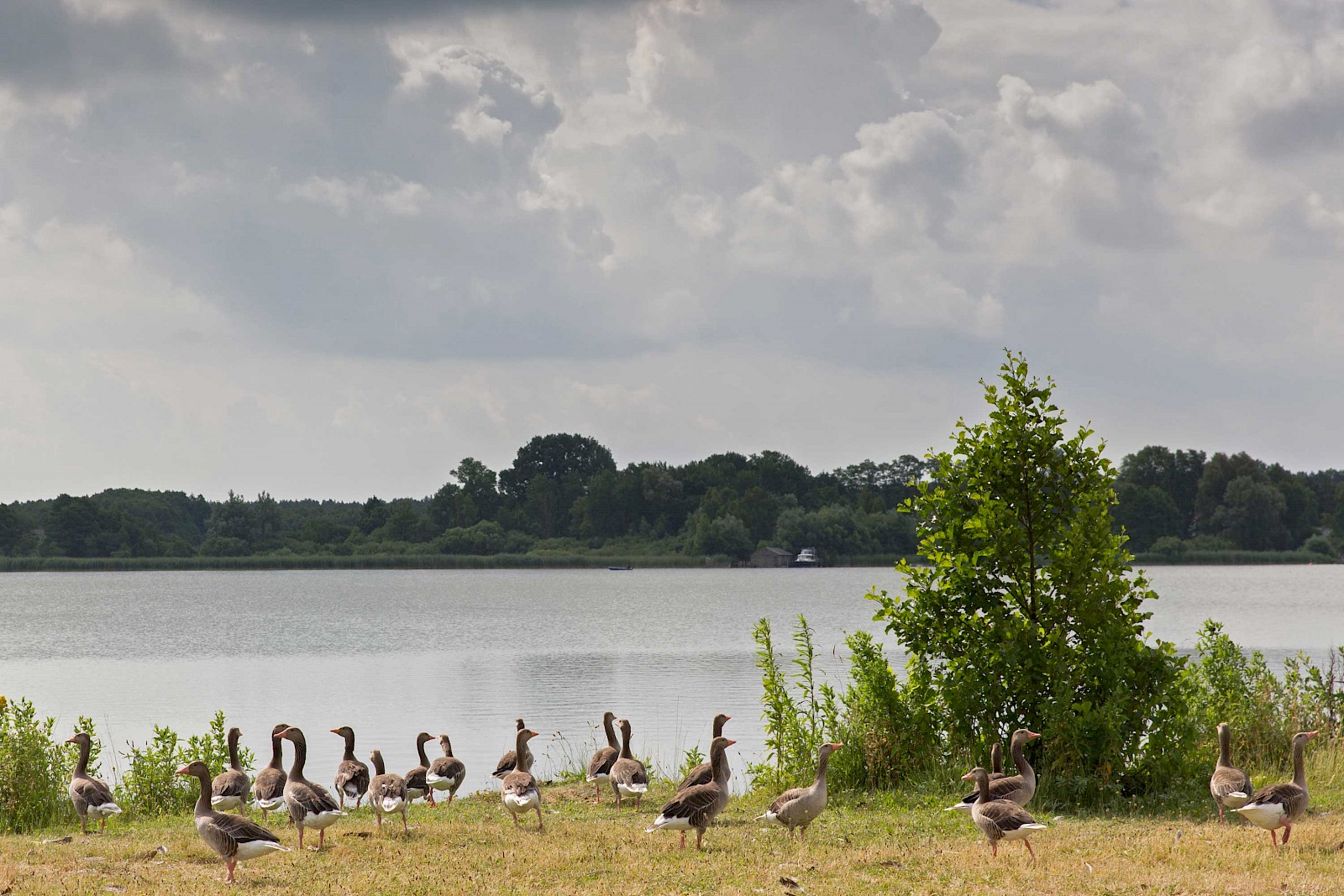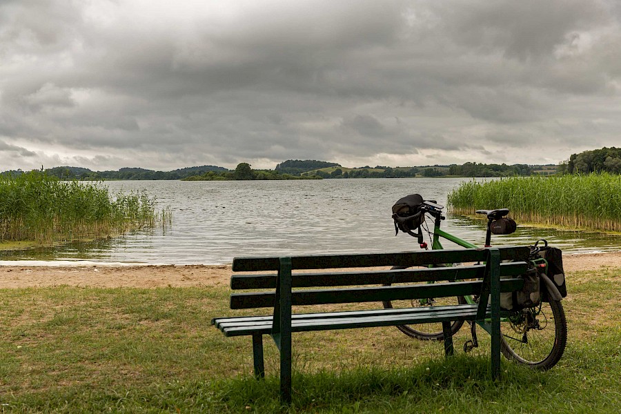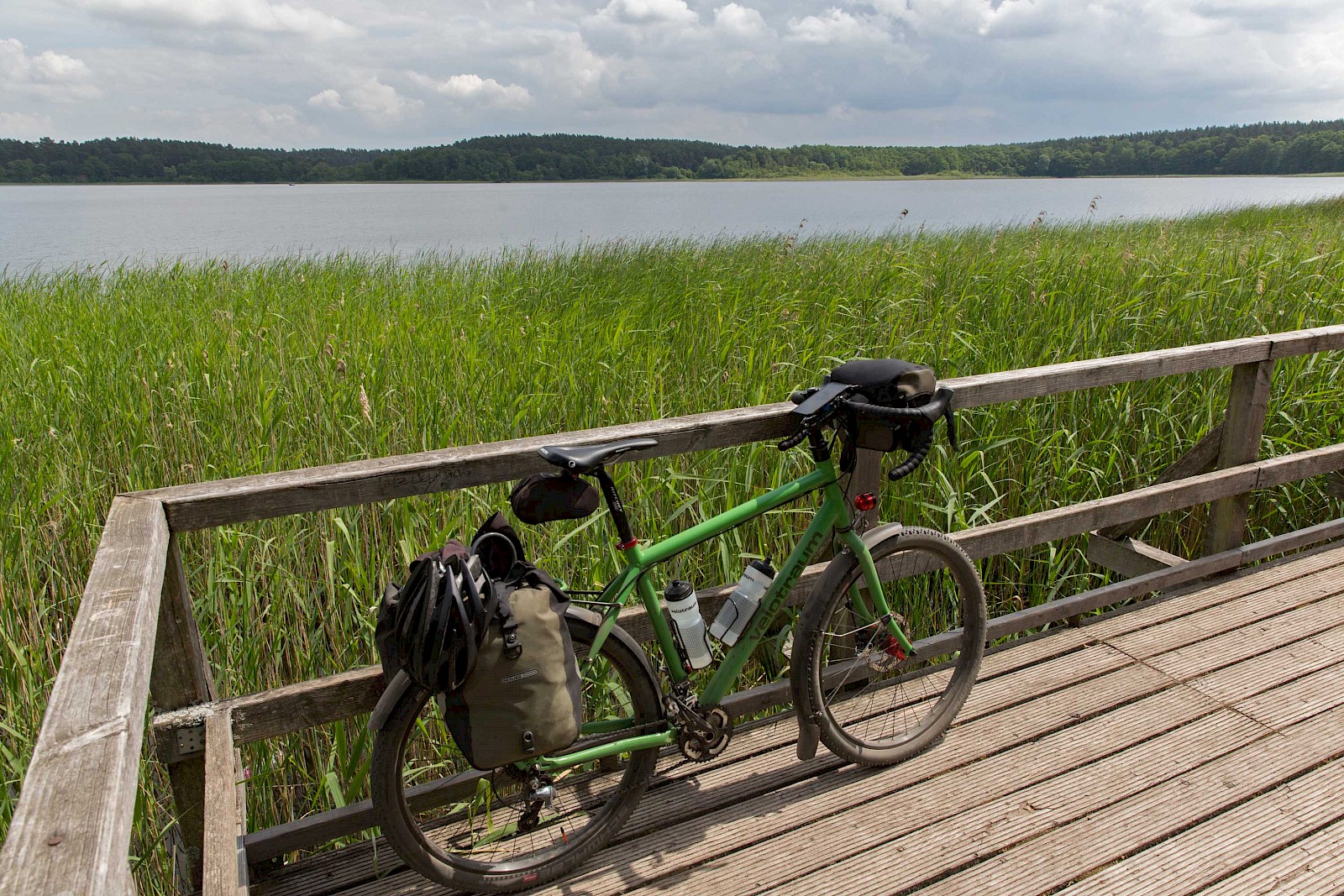 Scheiß Schotterstraßen – Vom Müritz-Nationalpark habe ich nicht viel gesehen, aber viel gespürt. Während die schmalen Kieswege gut zu fahren sind, waren die breiten Pisten vor und nach Klockow auf die Dauer sehr strapaziös: Schlaglöcher plus Wellblech. Dazu auch noch ein Plattfuß am Vorderrad, immerhin direkt am Käbelicksee, da wurde aus der Reparaturpause gleich noch eine Badepause.