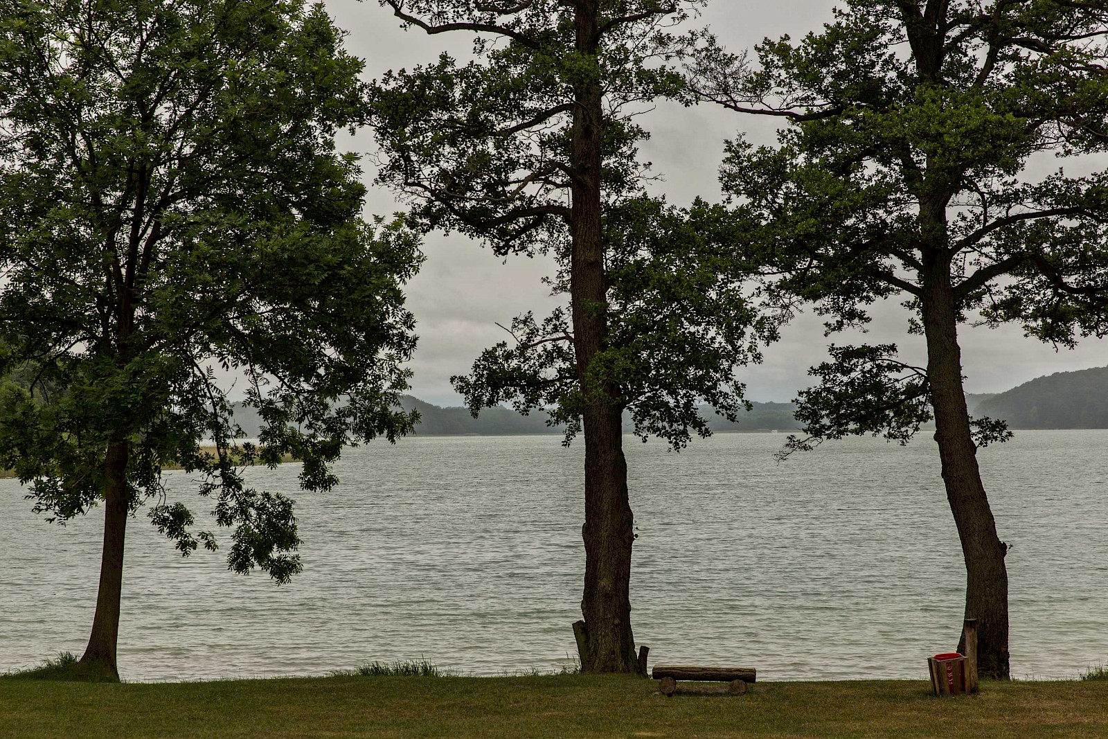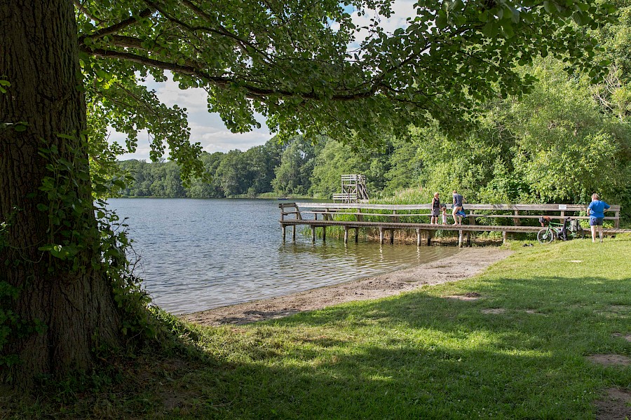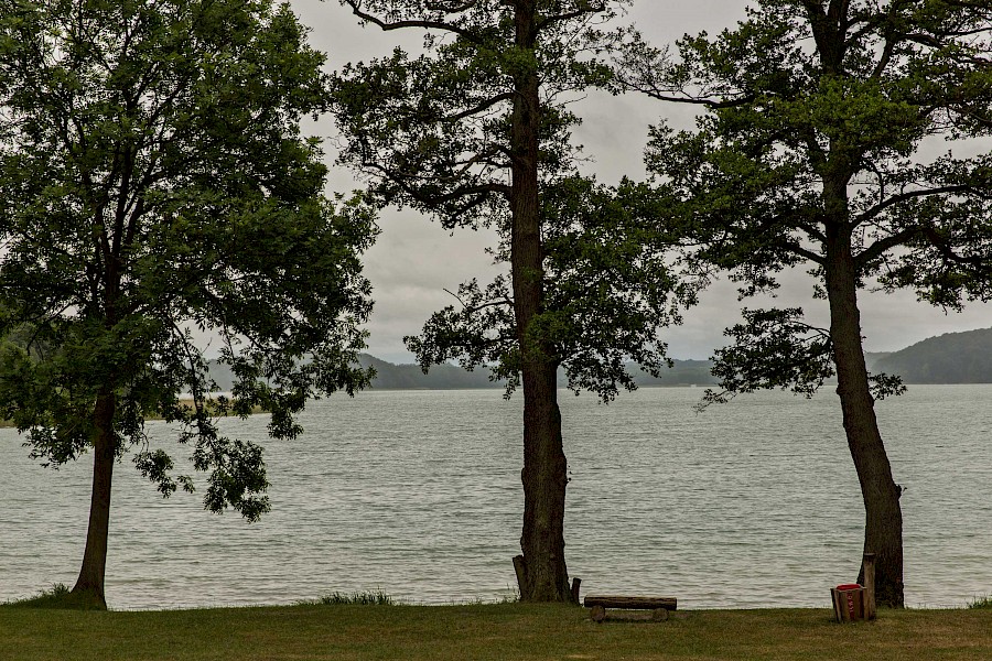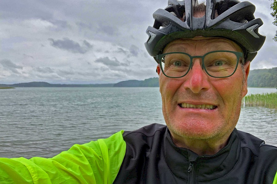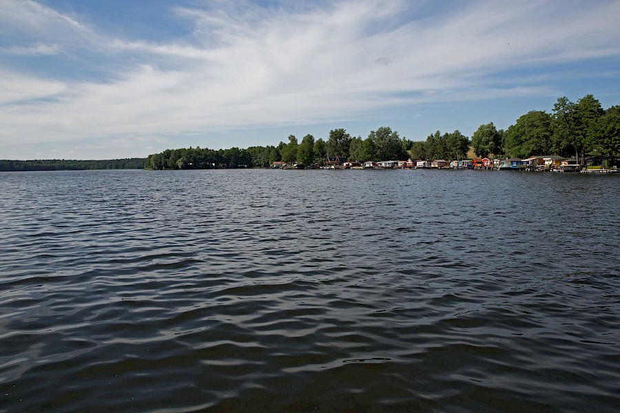 Scheiß Schotterstraßen – Vom Müritz-Nationalpark habe ich nicht viel gesehen, aber viel gespürt. Während die schmalen Kieswege gut zu fahren sind, waren die breiten Pisten vor und nach Klockow auf die Dauer sehr strapaziös: Schlaglöcher plus Wellblech. Dazu auch noch ein Plattfuß am Vorderrad, immerhin direkt am Käbelicksee, da wurde aus der Reparaturpause gleich noch eine Badepause.