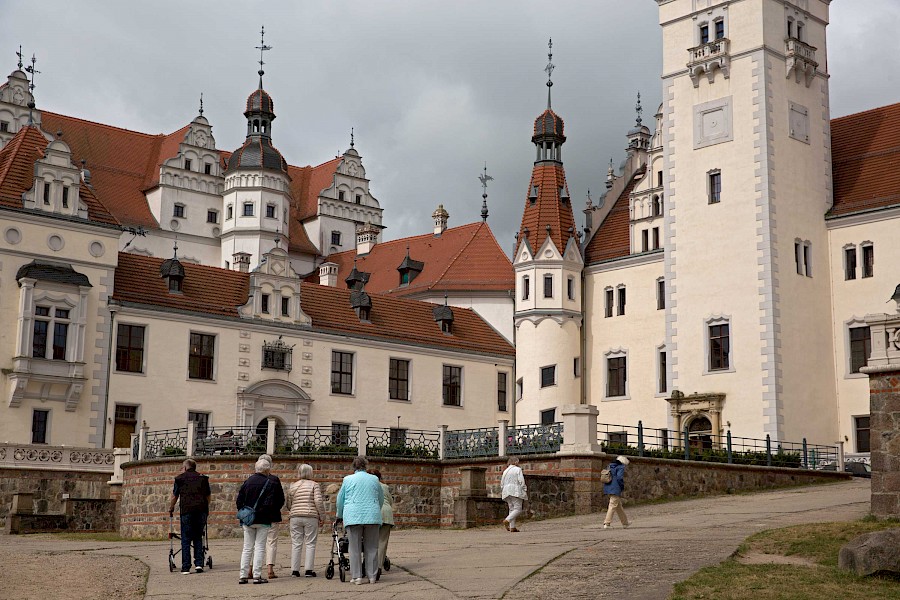Die nächste Pause machte ich ganz spontan im Schlosshotel Berdenfelde, einem herrschaftlichen Gutsgebäude im Tudorstil; dabei hatte ich das Schloss für mich allein. Ähnlich wie bei Berdenfelde steht man als Reisender nach Wald, Feldern und kleinen Dörfern plötzlich im »Schloss-Dorf« Basedow – einfach »wow«. Auf einer Bank im Schlosspark ließ ich das Ganze beim Müsliverzehr auf mich wirken.