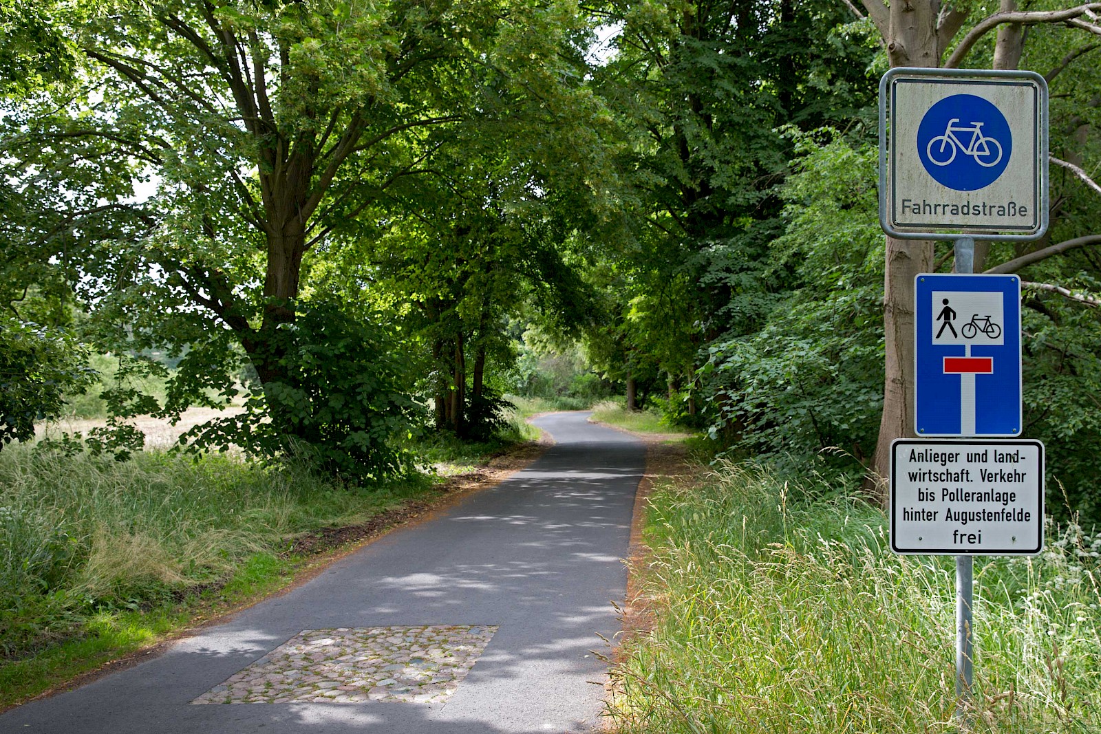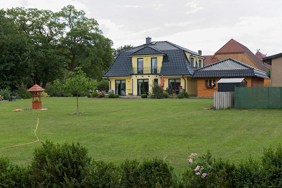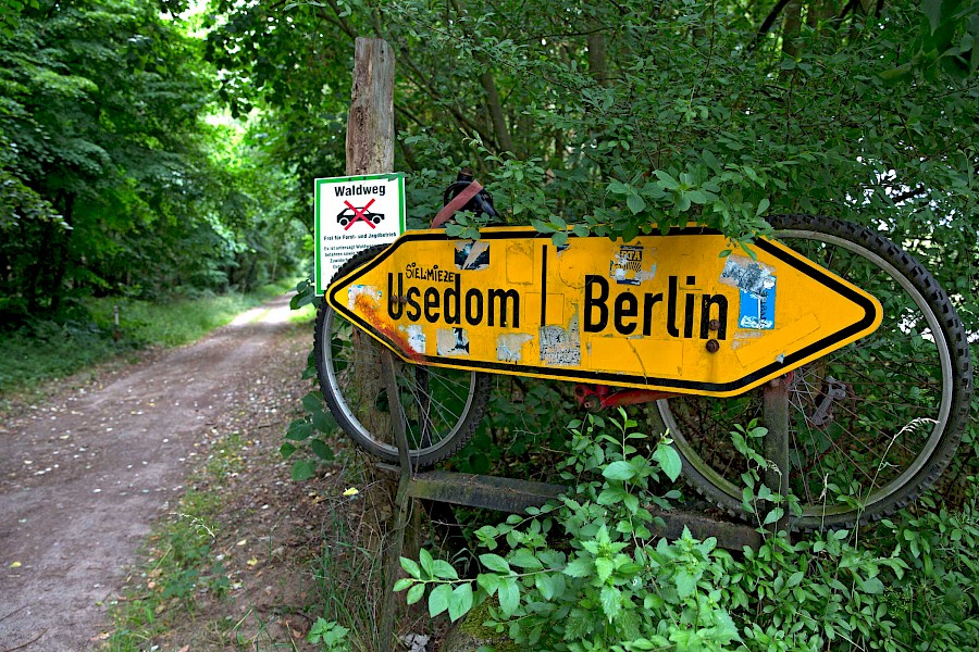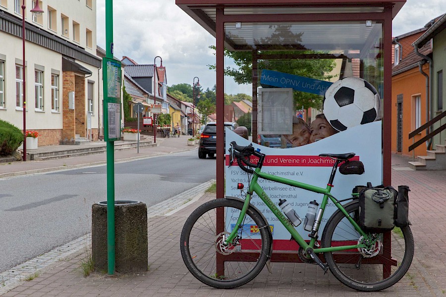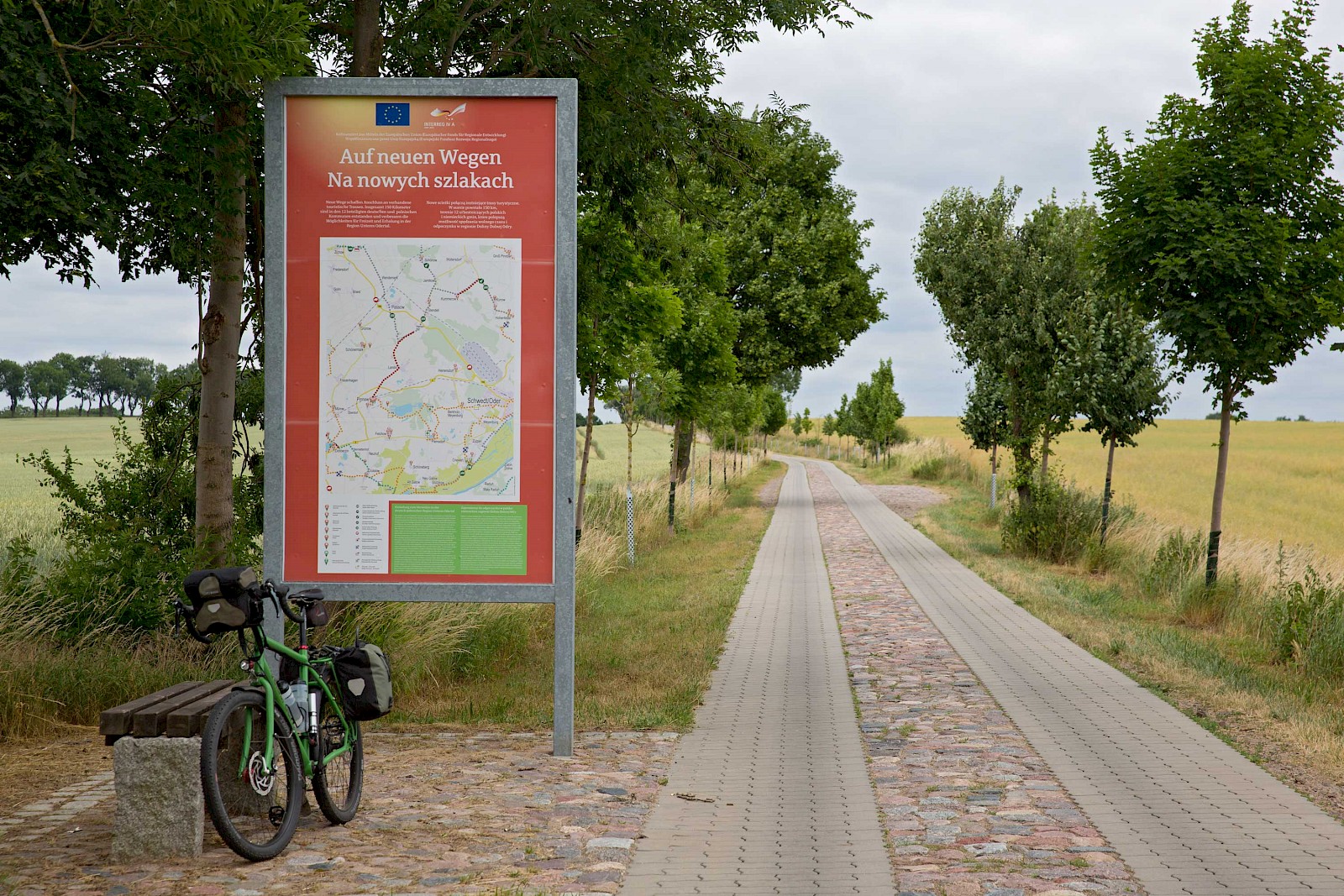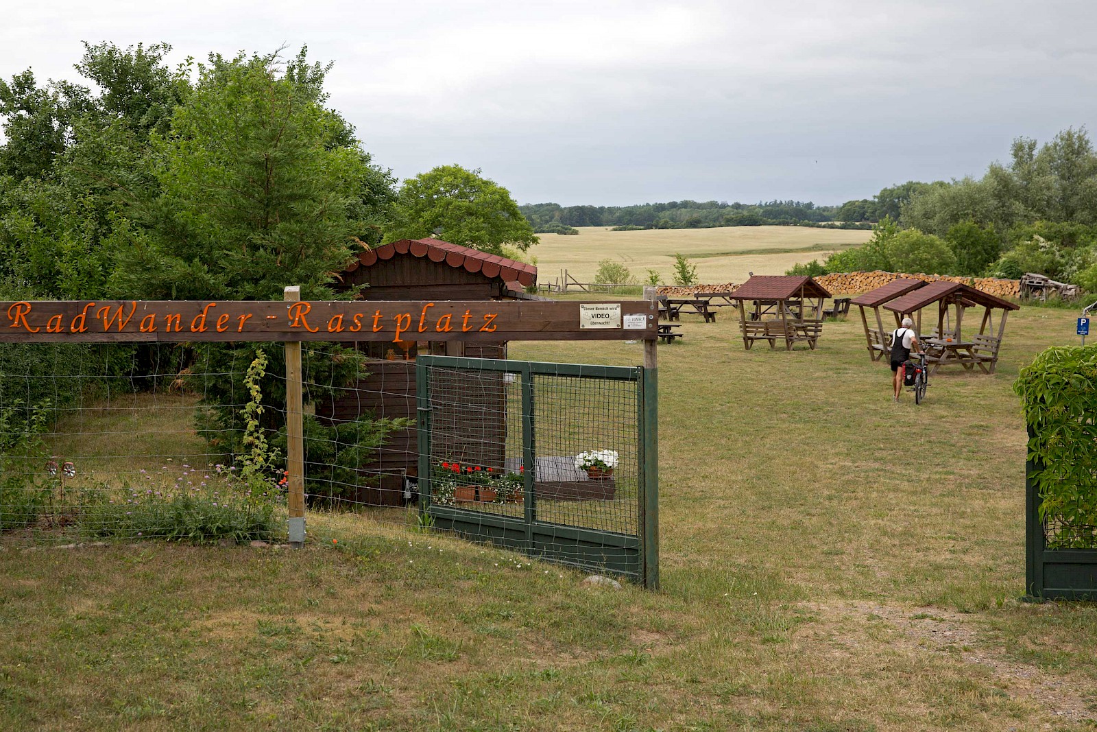Dennoch eine gute Entscheidung, denn erst nach 40 (!) km gab es in Steinhöfel eine Gelegenheit einzukehren. Dort kann man sehr privat auf der Wohnzimmer-artigen Hinterhof-Terrasse Platz nehmen. Gesellschaft leistete die beleibte Wirtin persönlich. Bis dahin war ich viel über schnurgerade Landstraßen aber auch unglaublich schöne Radwege gefahren. Inzwischen befand ich mich auf dem offiziellen Radfernwanderweg Berlin/Usedom, und nach Steinhöfel nehmen die Einkehrmöglichkeiten sprunghaft zu ;-)