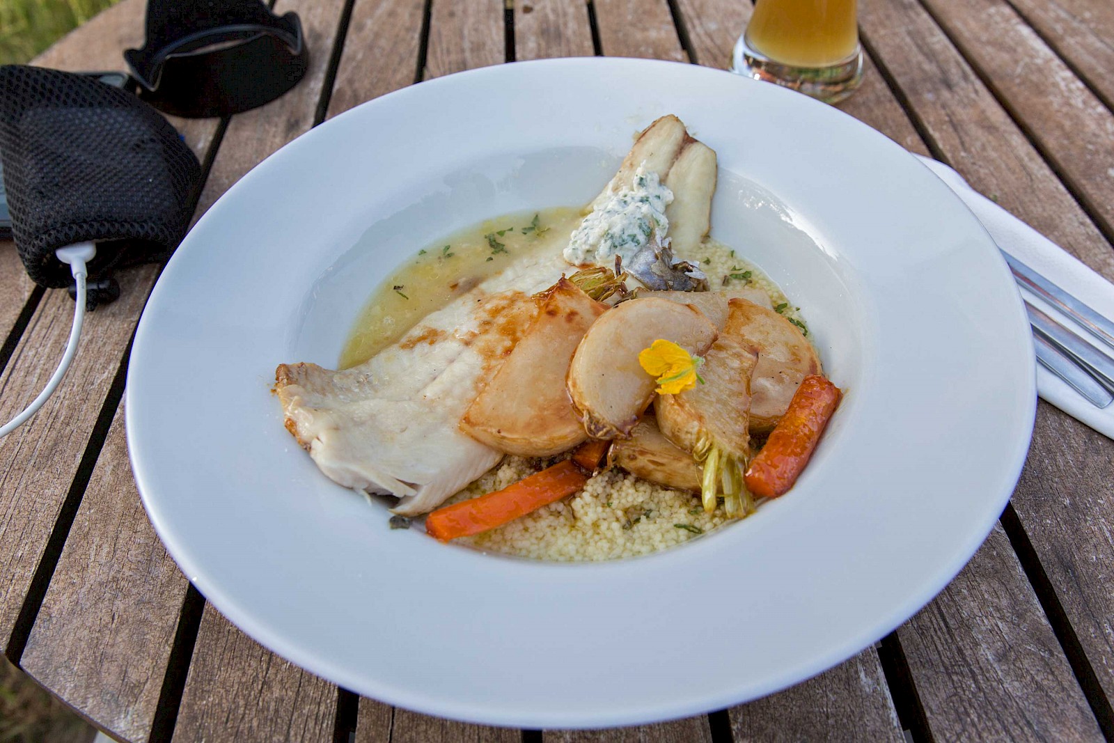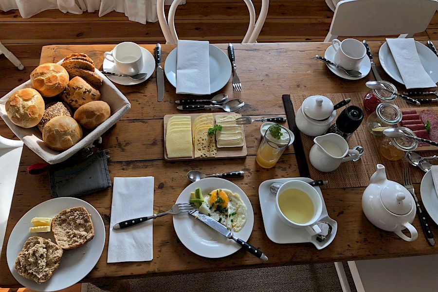 Die Nacht war gut und um acht saß ich nach einem Morgenspaziergang beim Frühstück, welches von der Auswahl überschaubar, aber von sehr guter Qualität war. Übrigens – Das ganze Arrangement, Essen, Getränke und Frühstück, hat 92 EUR gekostet – also jeden Cent wert.
