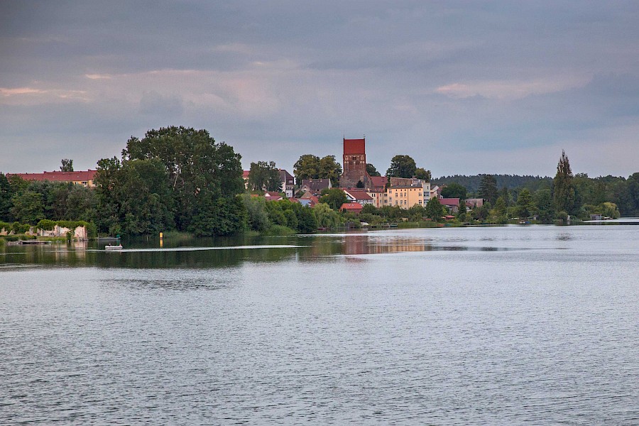Mein nächstes Ziel war Fürstenwerder welches auf der Karte mit historischer Stadtmauer ganz interessant wirkte. Allerdings war die Strecke dahin ein wenig eintönig. Auf einer ehemaligen Bahnstrecke rollte man zwar auf gutem Belag, links und rechts allerdings viele monotone Maisfelder. Fürstenwerder als Ort war eher spröde, allerdings gibt es unten am See einen netten Park mit Badewiese. Bei schönem Wetter sicher schwer, wieder weg zu kommen. Bei Wind, 15 Grad und leichtem Niesel …