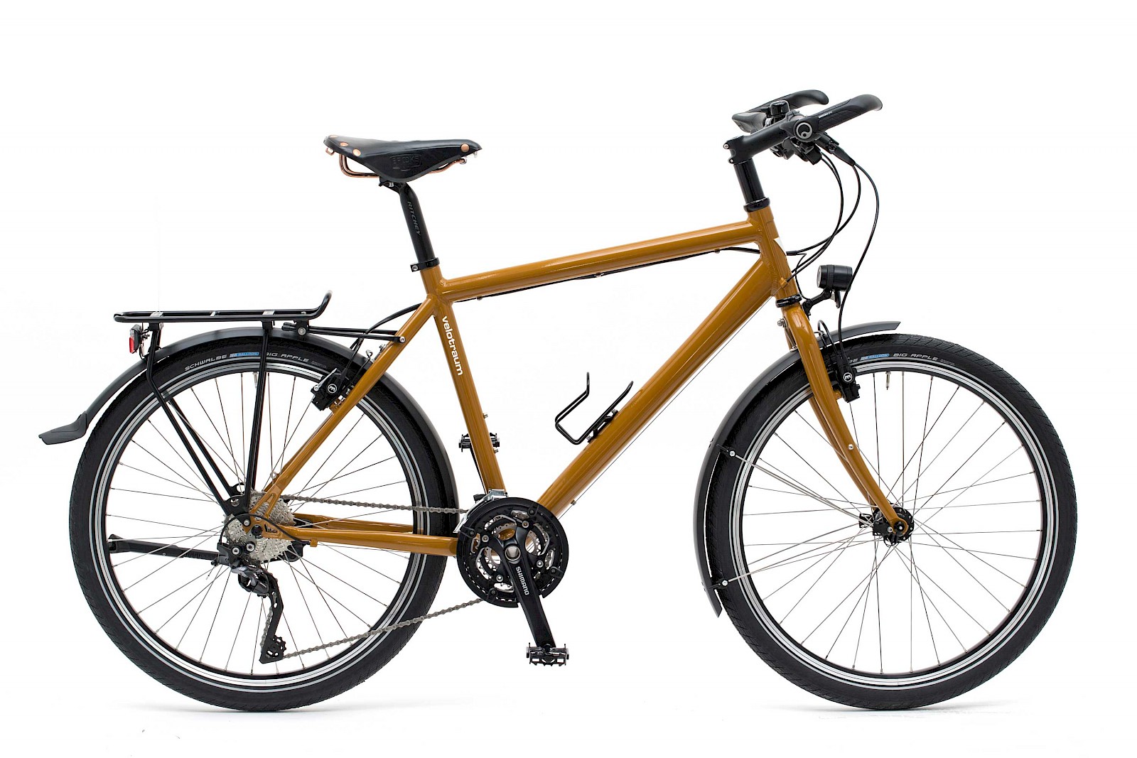 KONZEPT VK3 – Nackige Fahrräder – also ohne Schutzblech und Lichtanlage – werden bei Velotraum eher selten in Auftrag gegeben, sogar beim »Speedster« und »Finder«. Kurzum, so ein VK3, mit kleinem Tubus-Vega-Gepäckträger fällt optisch aus der Reihe. An der leicht andersartigen Silhouette ist aber auch noch das Reifenformat beteiligt. Einen Schwalbe Almotion in 55-584 würde man eher im »Finder« vermuten.
