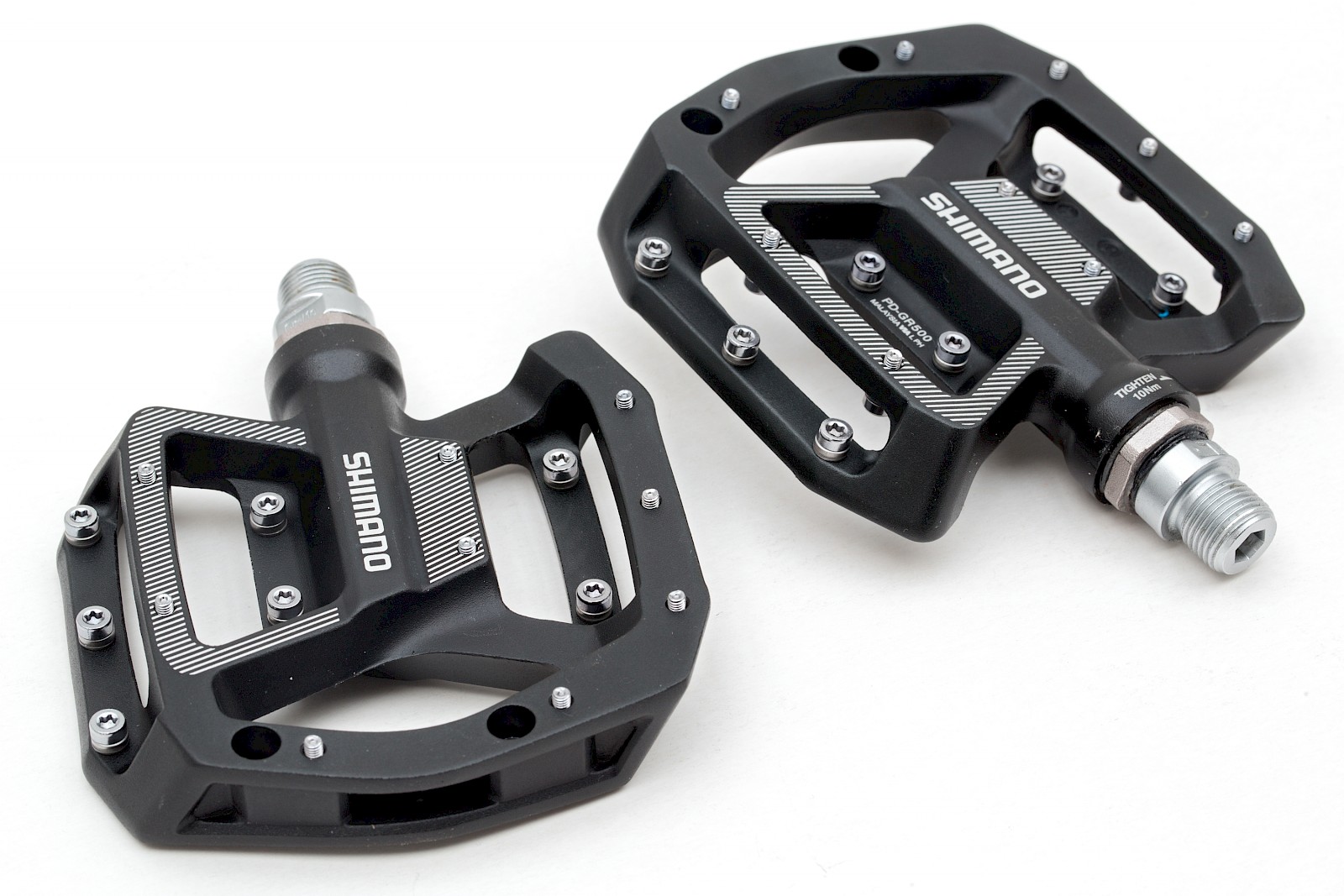 Shimano PD-GR500 – Neu bei den Pedalen ist auch das Shimano »PD-GR500«. Ein großflächiges und ausgesprochen hochwertiges Plattformpedal mit Spikes. Darauf finden sowohl große Füße sowie voluminöses Schuhwerk sicheren und komfortablen Halt. Gewicht 490 Gramm.