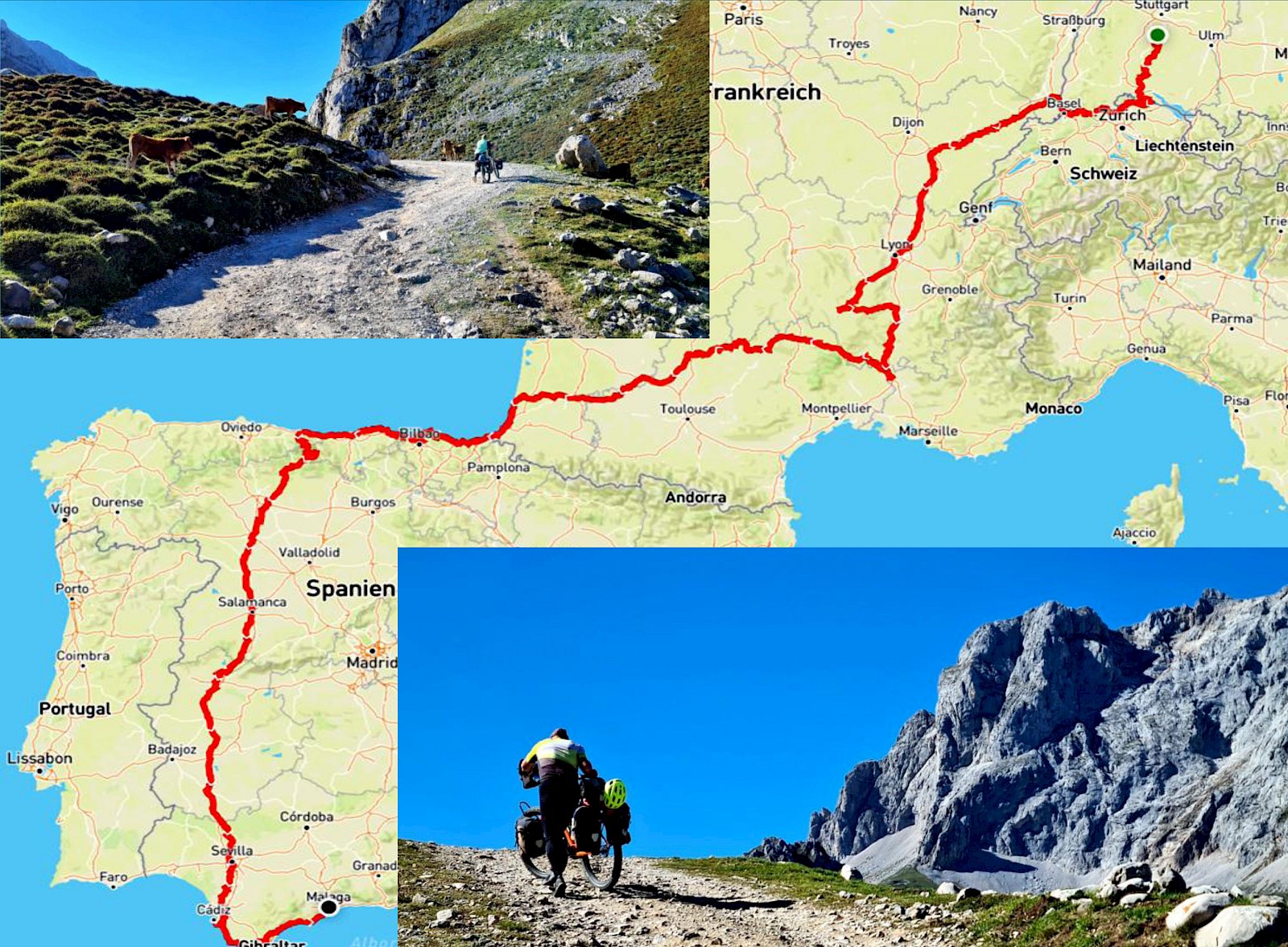 »Der zweite Teil folgte dann ab Anfang Oktober und es ging von Bilbao aus zunächst durch das grüne Kantabrien weiter an der beeindruckenden Nordküste Spaniens. Danach radelten wir durch den Nationalpark Picos de Europa, teilweise auf abenteuerlichen Strecken mit bis zu mehr als 3-stündigen Schiebepassagen. Weiter ging es durch die Extramadura über Salamanca bis nach Sevilla in Andalusien, die meiste Zeit dem Pilgerweg der sogenannten Ruta de la Plata folgend. Von Sevilla aus war es nicht mehr weit bis zum Atlantik und als wir in Cadiz angekommen sind, hatten wir einmal Spanien von Nord nach Süd durchquert.Über Gibraltar gelangten wir dann am Mittelmeer entlang schlussendlich an unser Ziel in Malaga.«