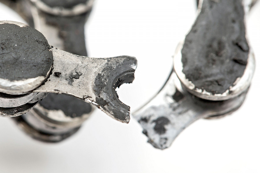 Die Kette stammt aus einem FD2E-Pedelec, das nur gefahren – gerne im Wiegetritt – und nur sehr wenig gewartet wird. Zudem wurde die Kette weit über die Verschleißgrenze hinaus gefahren, so zirka 4.000 bis 5.000 Kilometer hatte diese Kette auf dem Buckel. Woher wir das so genau wissen: Die Kette stammt aus dem Fahrrad des Chronisten …