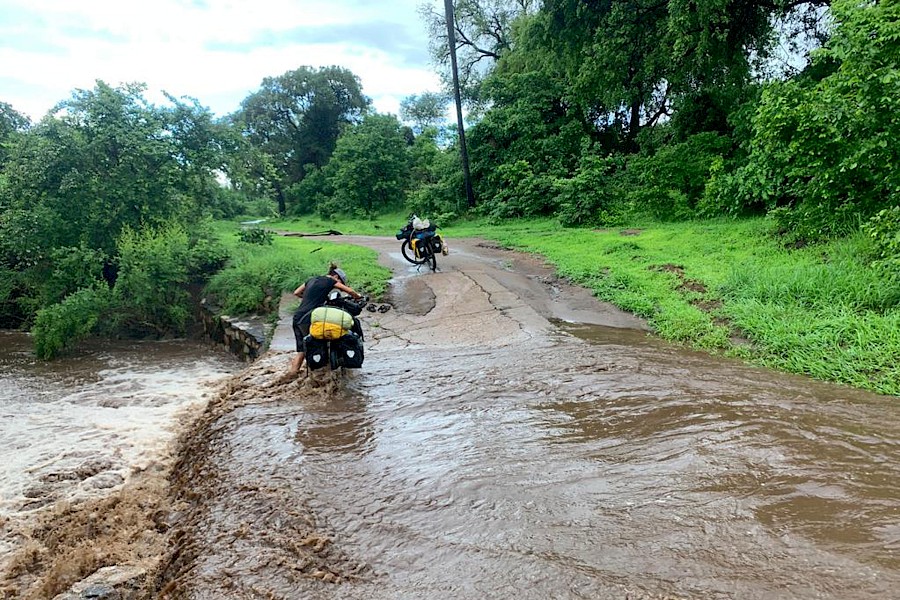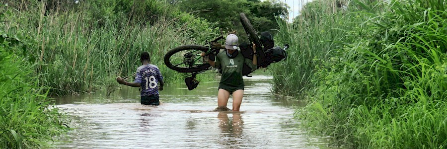 Doch dann wird es plötzlich gespenstisch still. Keine Dörfer säumen mehr unseren Weg, keine Rufe und Pfiffe hallen uns nach und Autos sind hier in dieser Jahreszeit ebenfalls kein Thema, aber wir begegnen einigen stark strapazierten und regelmäßig absaufenden Motorradfahrern und Die-Hard-Barfußradlern, die uns immer wieder die ein oder andere Umfahrung unpassierbarer Wegstrecken zeigen oder mit gutem Beispiel bei einer weiteren Flussdurchquerung vorangehen.